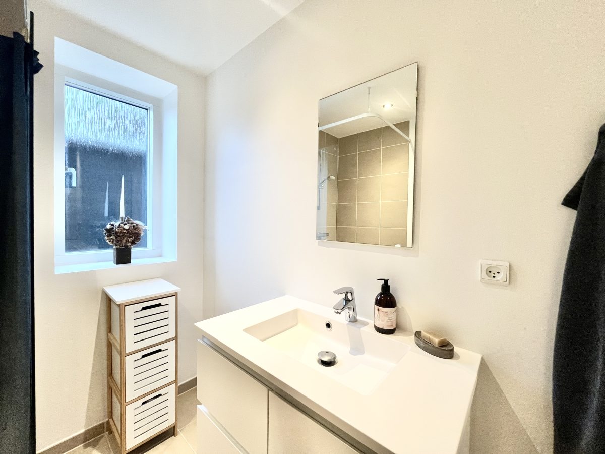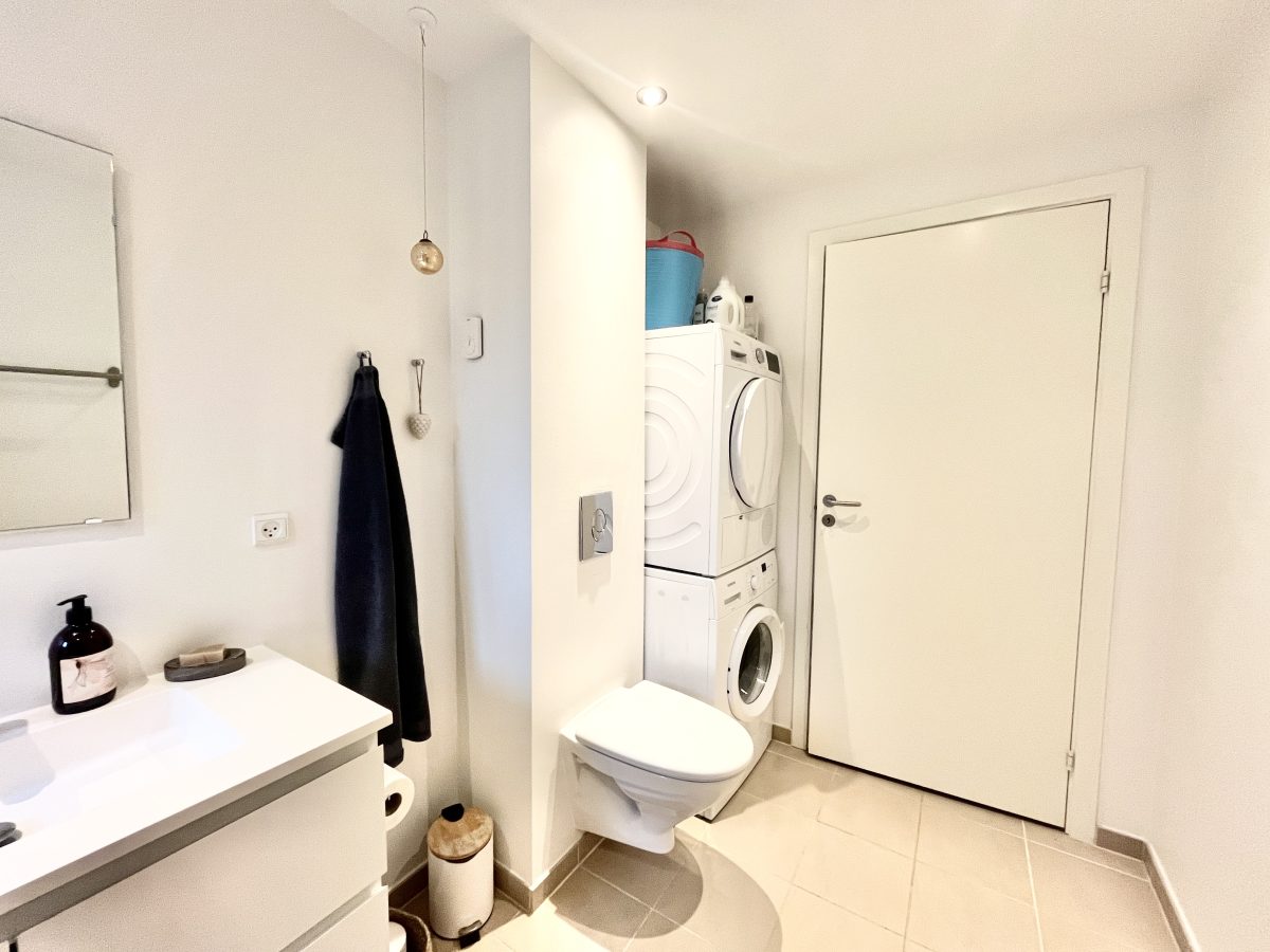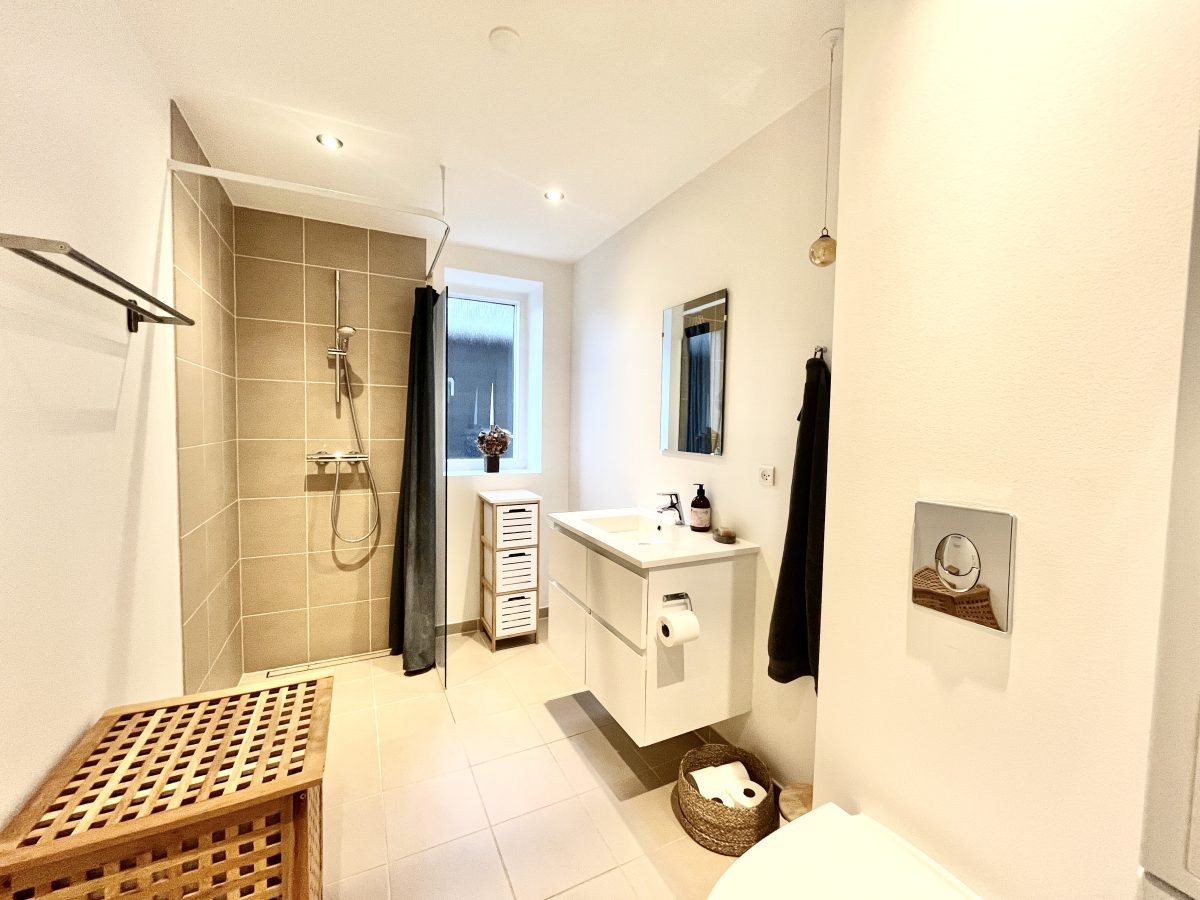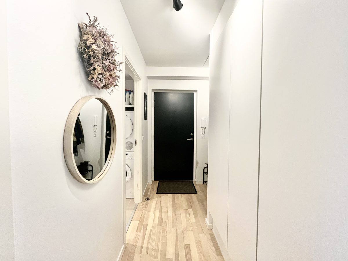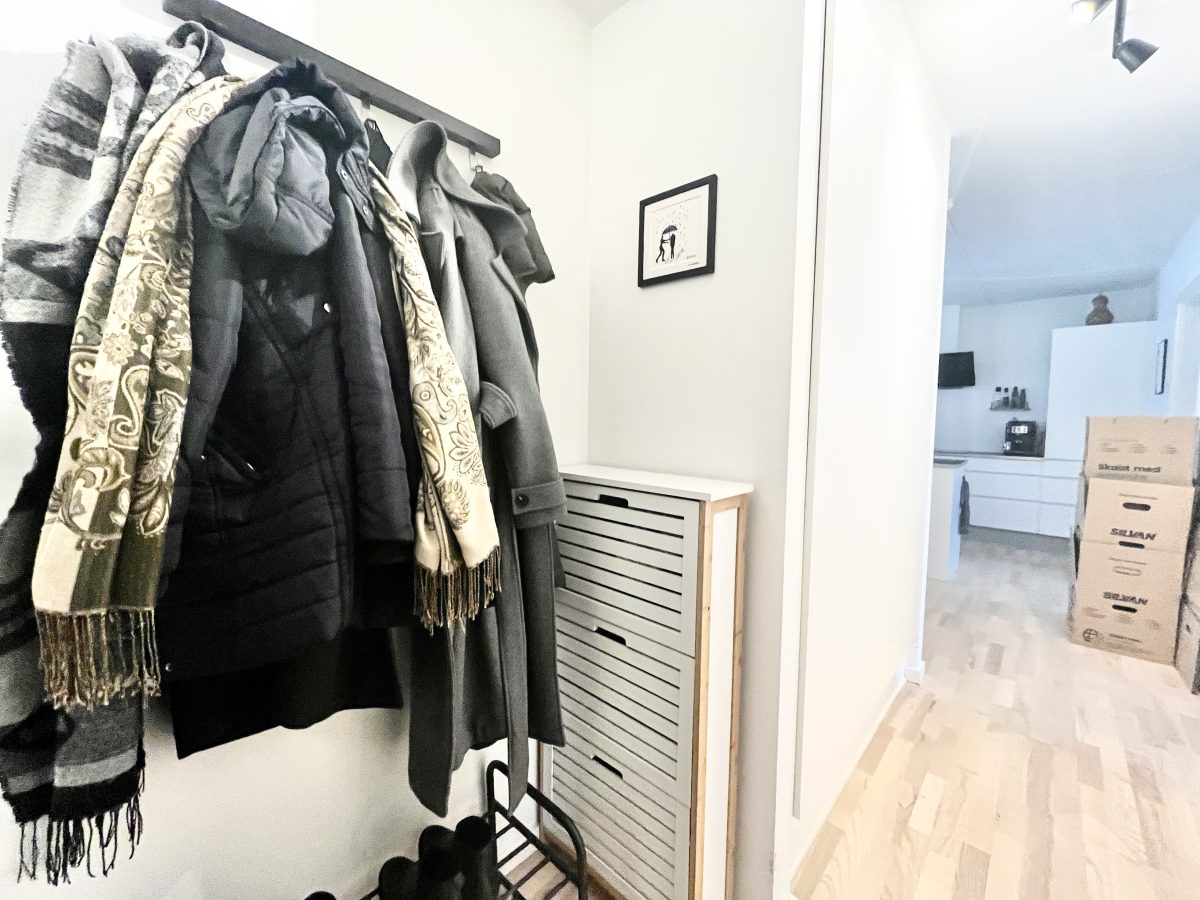 Boligen er indrettet godt med en praktisk fordelingsentré, hvor du har adgang til lejlighedens rummelige badeværelse med vaskesøjle.