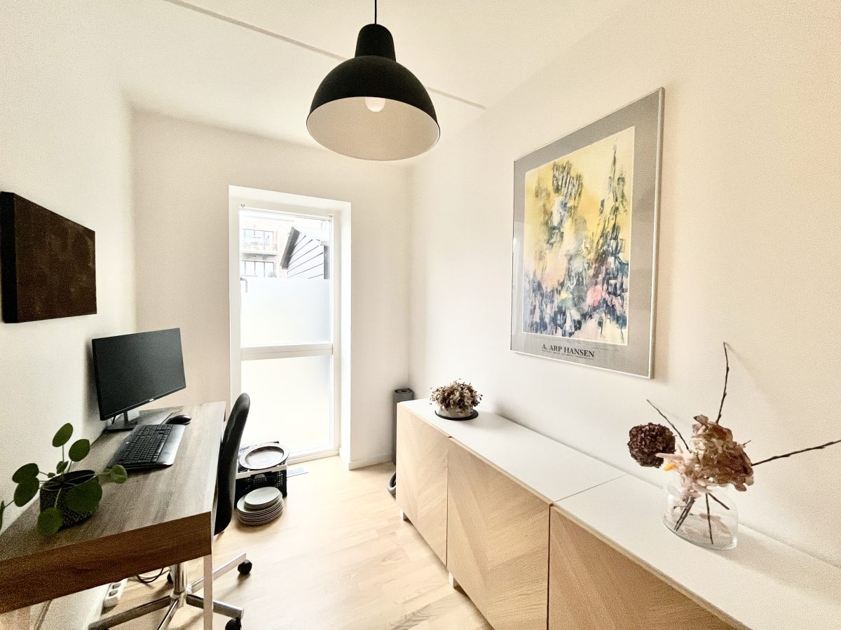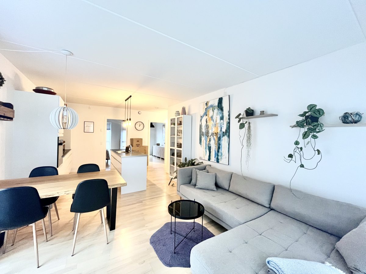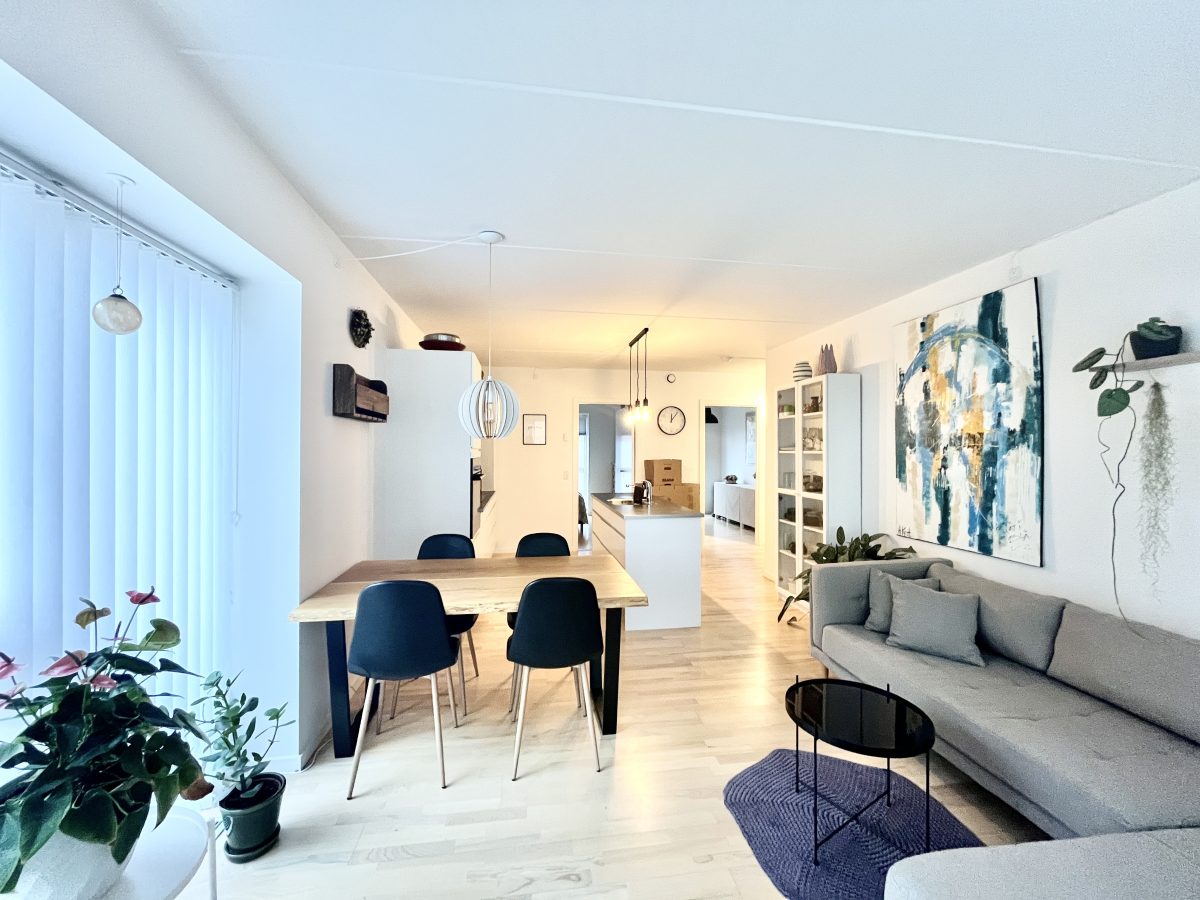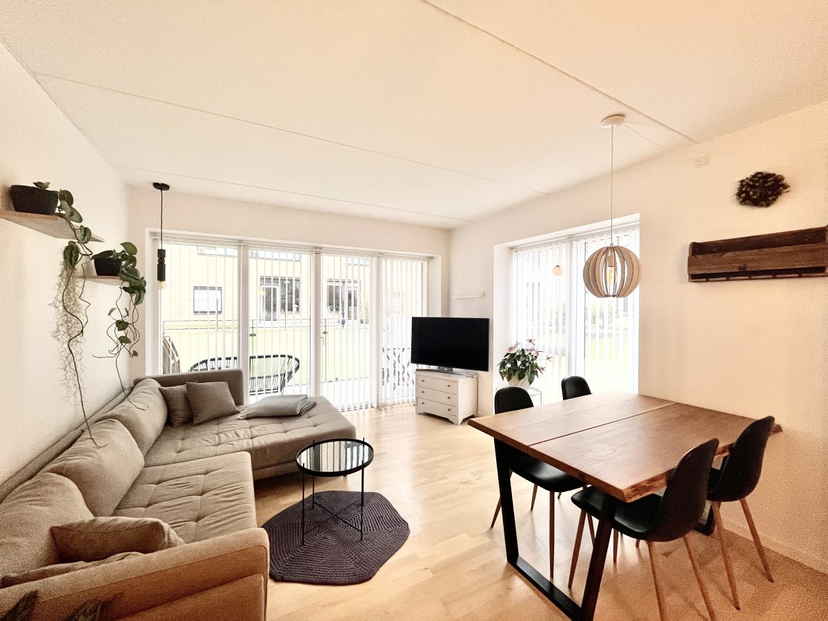 Stuen byder på dejligt lysindfald grundet de store vinduespartier - hvor du også har adgang lejlighedens store, sydvendte altan.