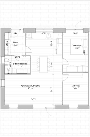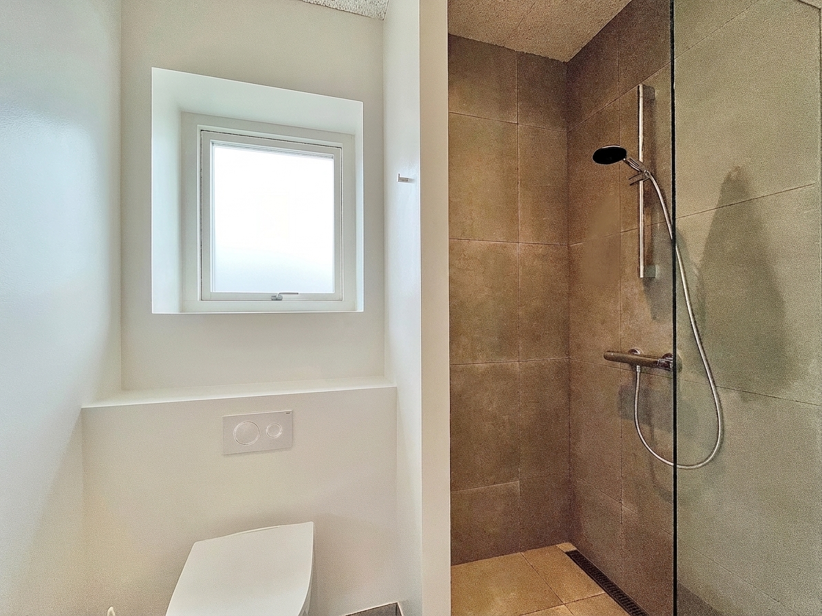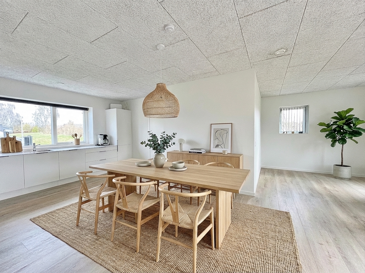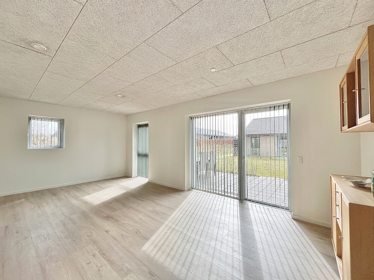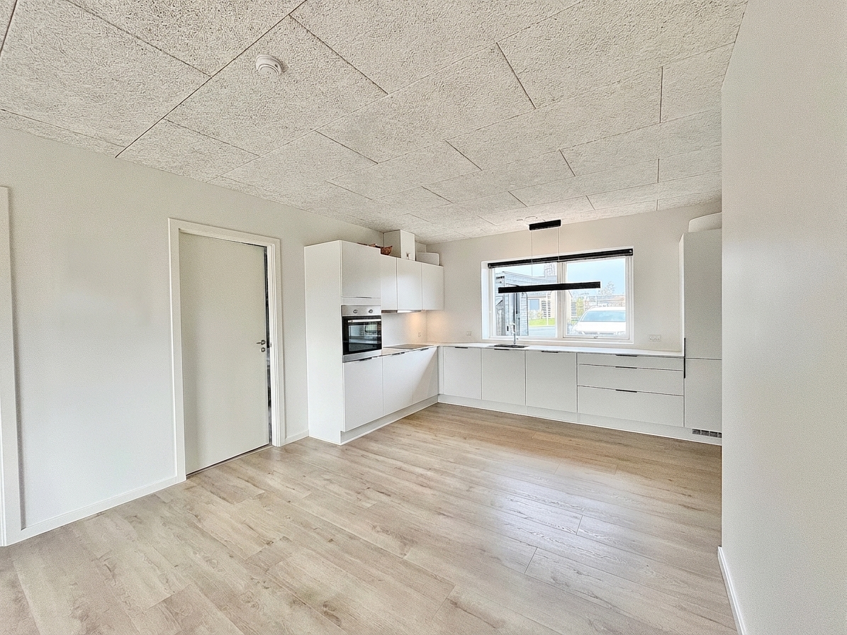 Boligens hjerte er et lyst opholdsmiljø, hvor køkken og stue er samlet i en åben og indbydende løsning. Her skaber de store vinduespartier et naturligt lysindfald, som giver rummet en let og venlig atmosfære.