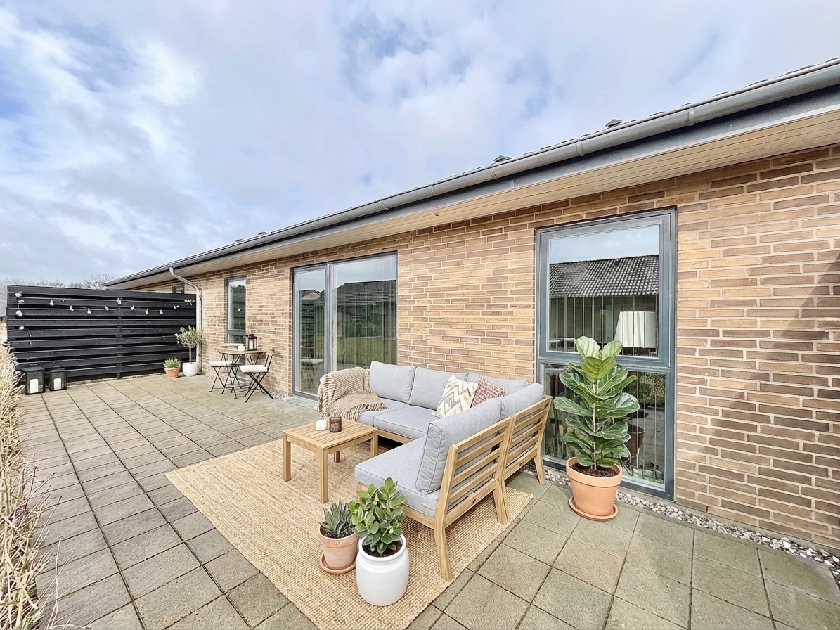 Udendørs får du stor sydvendt privat have, som giver mulighed for afslapning og udeliv i rolige omgivelser tæt på hjemmet.