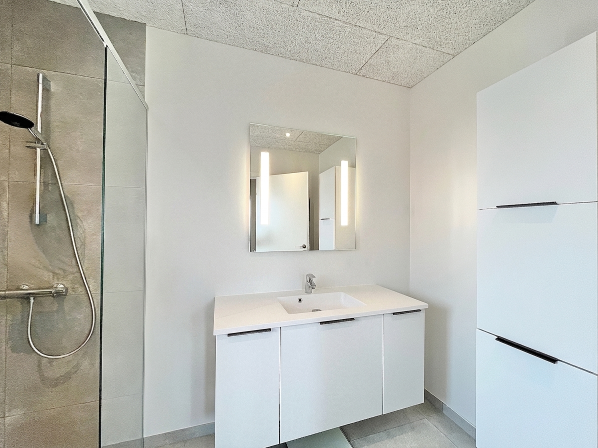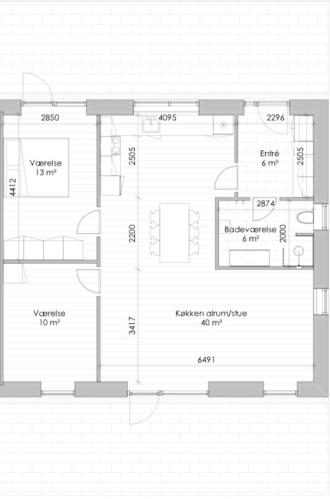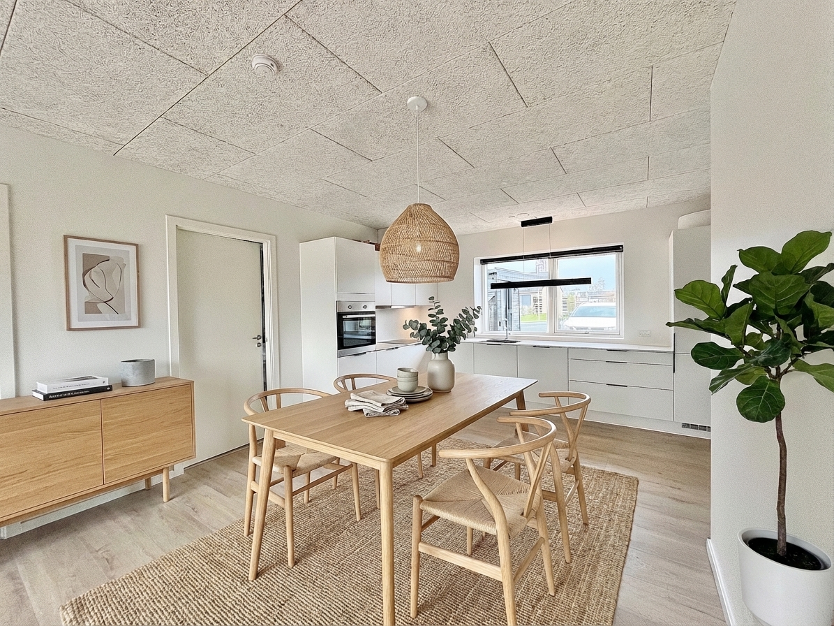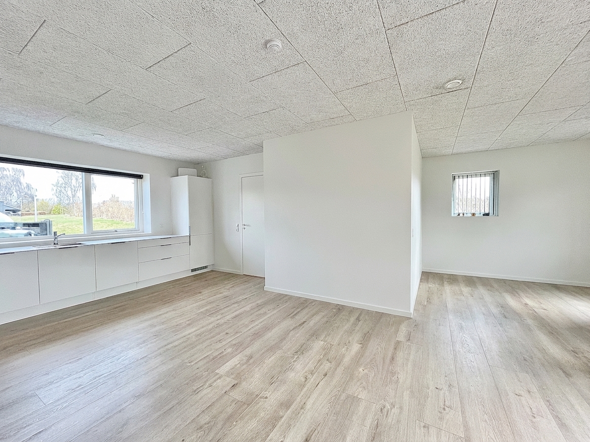 Boligens hjerte er et lyst opholdsmiljø, hvor køkken og stue er samlet i en åben og indbydende løsning. Her skaber de store vinduespartier et naturligt lysindfald, som giver rummet en let og venlig atmosfære.