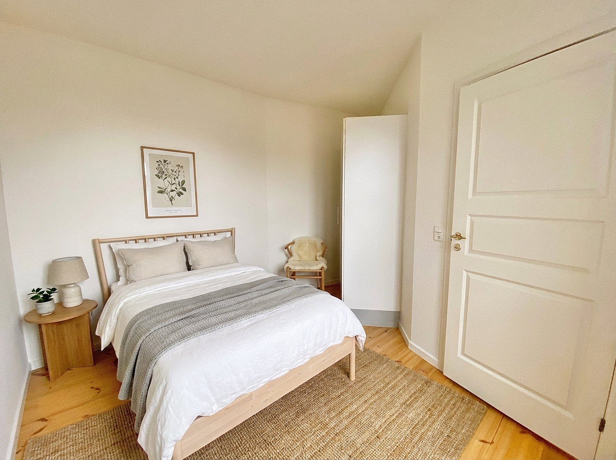 Soveværelset er også af praktisk størrelse og er udstyret med indbyggede skabe for ekstra opbevaringsplads.