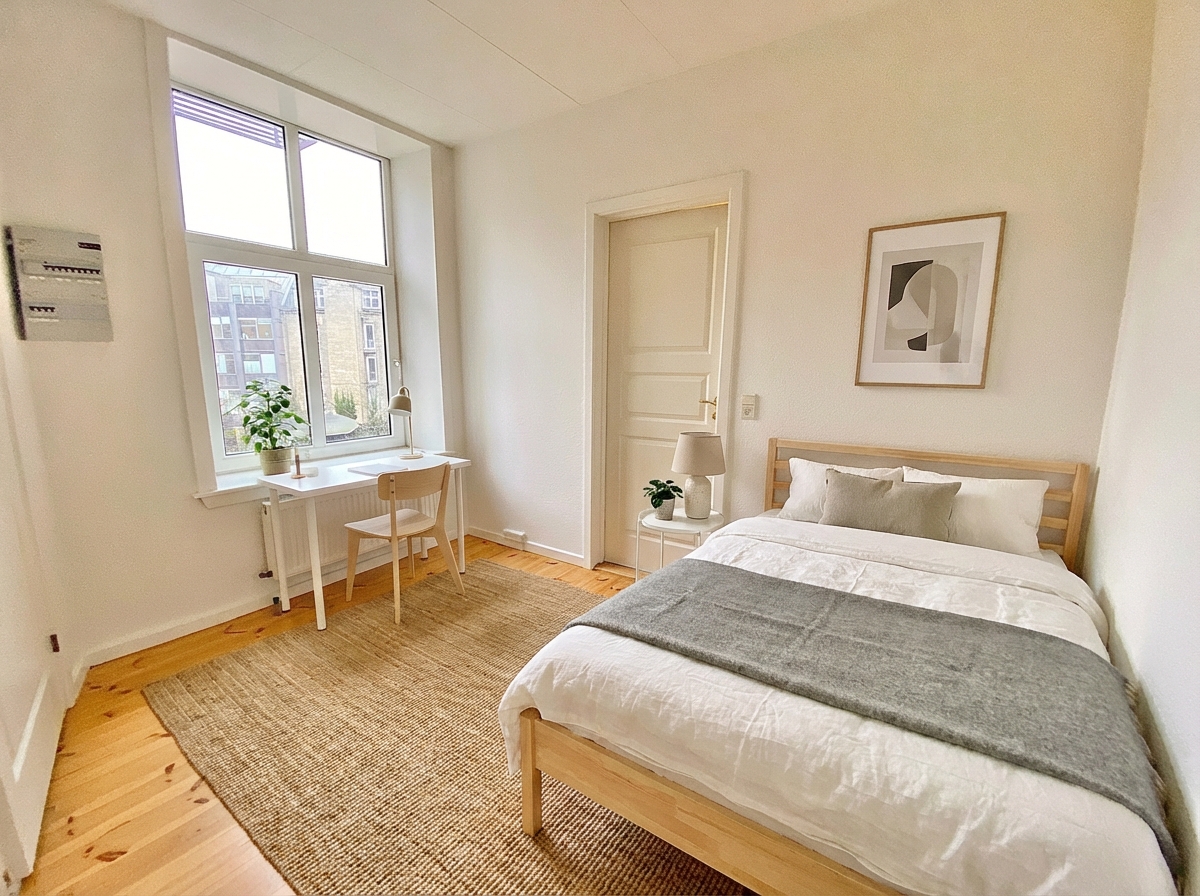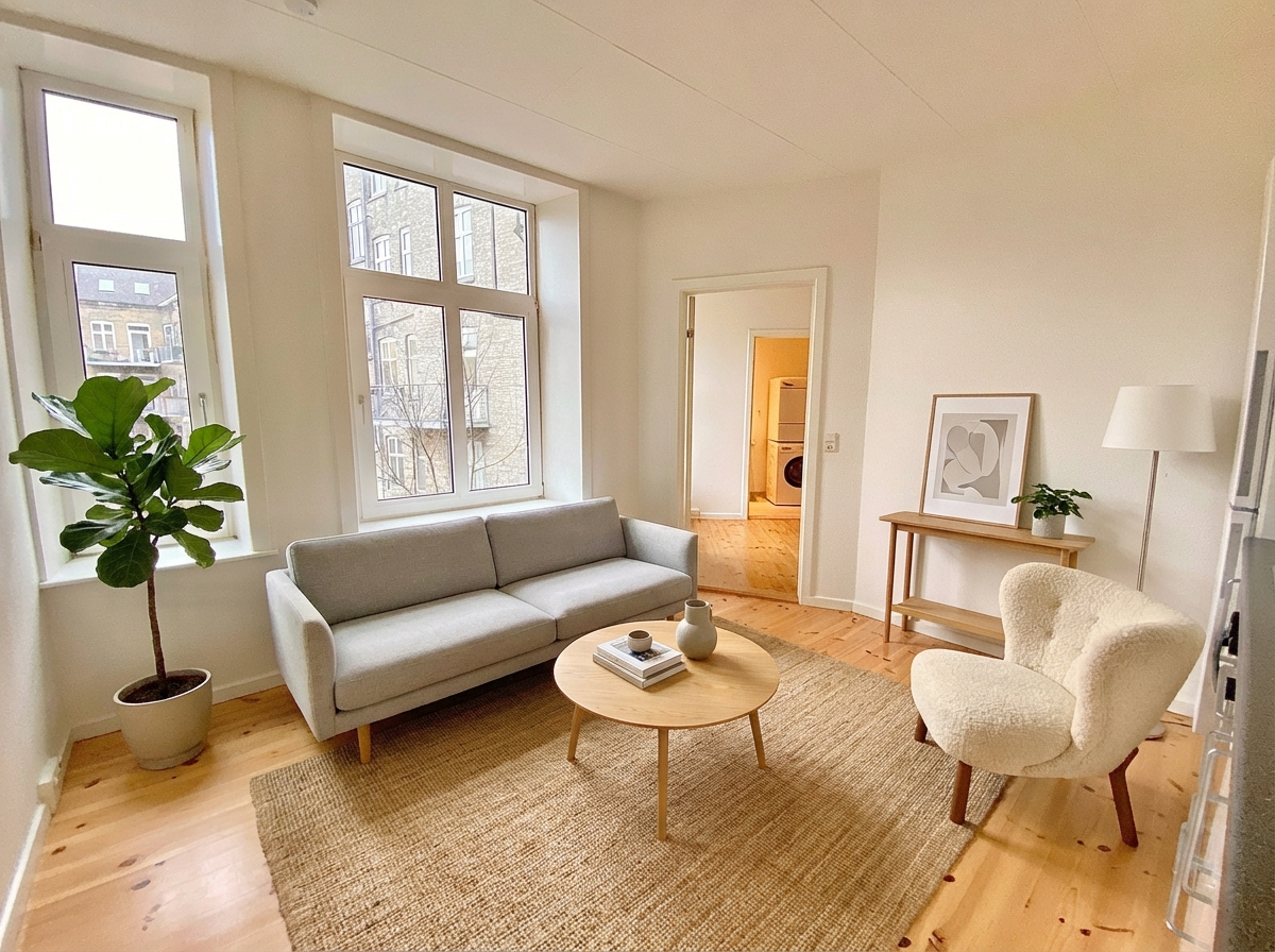 Lejligheden er indrettet med et kombineret køkken/alrum med et dejligt lysindfald fra de store vinduespartier mod den rolige og hyggelige baggård.