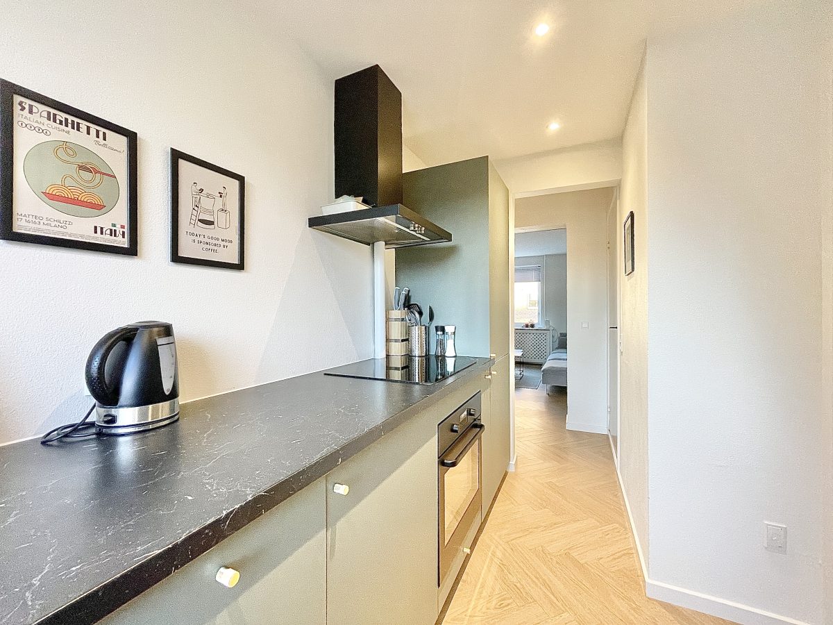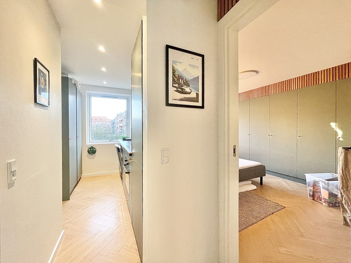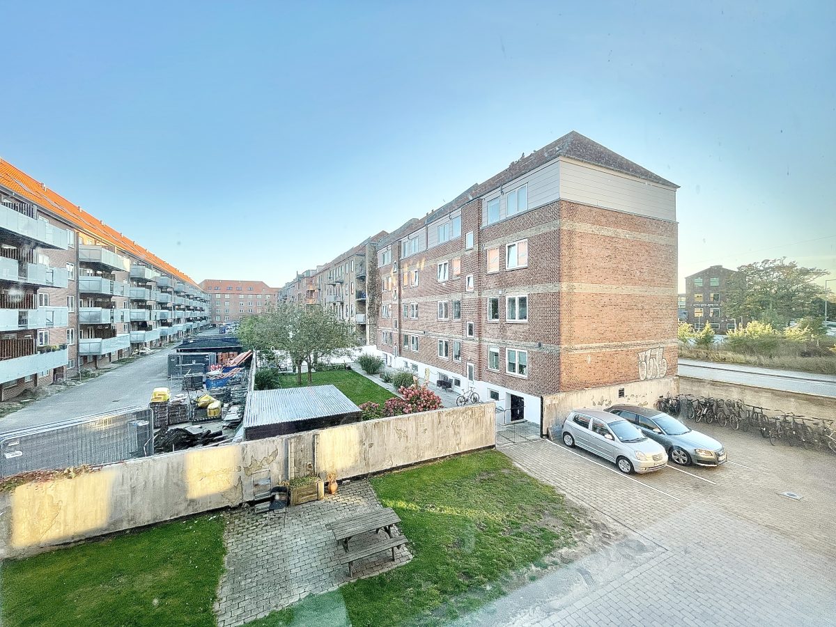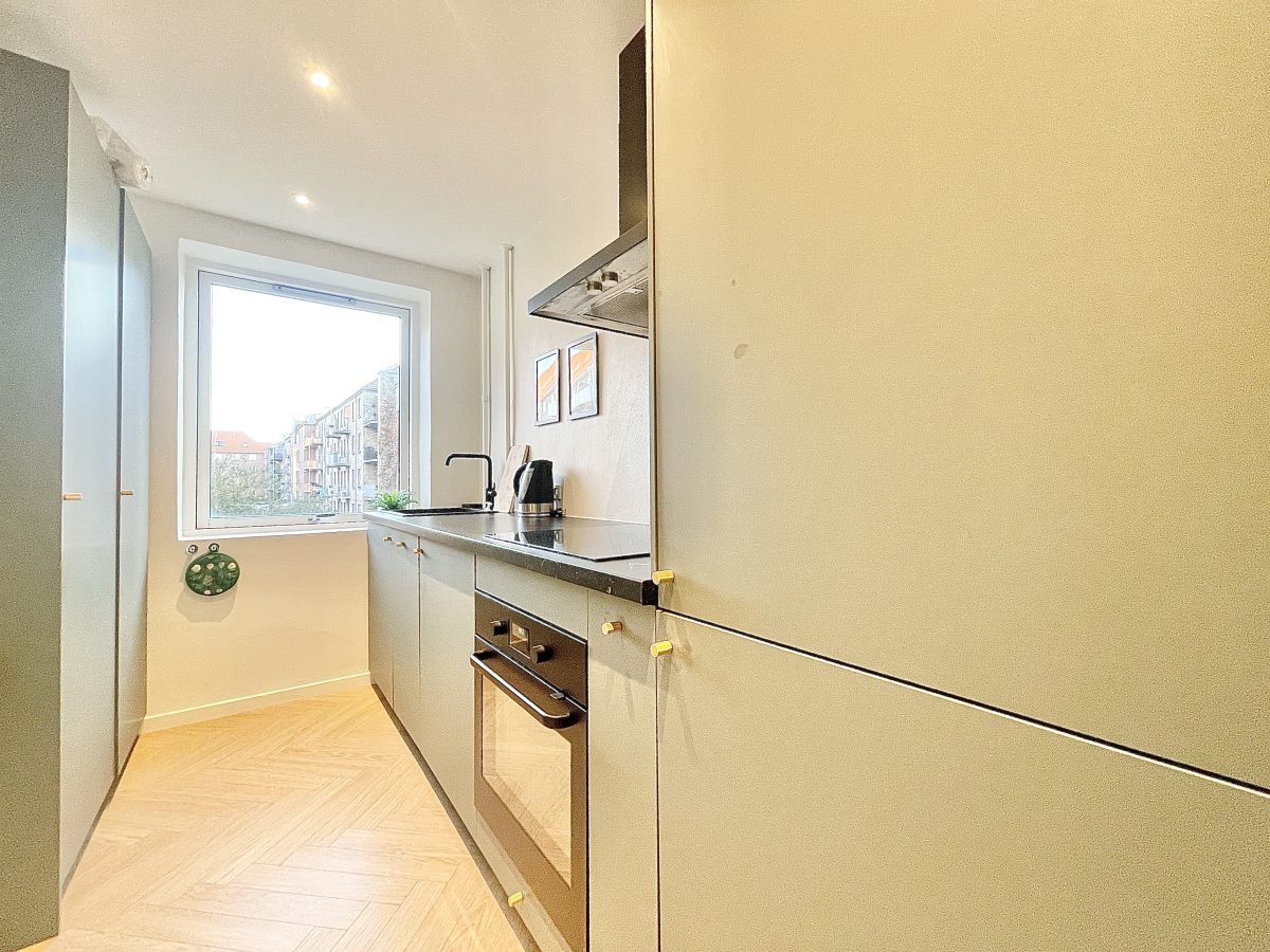 Køkkenet fremstår lyst, nyt og super pænt. Der er en dejlig udsigt både ud over vestbyens grønne arealer, men også til ejendommens gårdmiljø. I køkkenet er der desuden installeret opvaskemaskine - mens der i lejligheden ligeledes er installeret vaskemaskine.