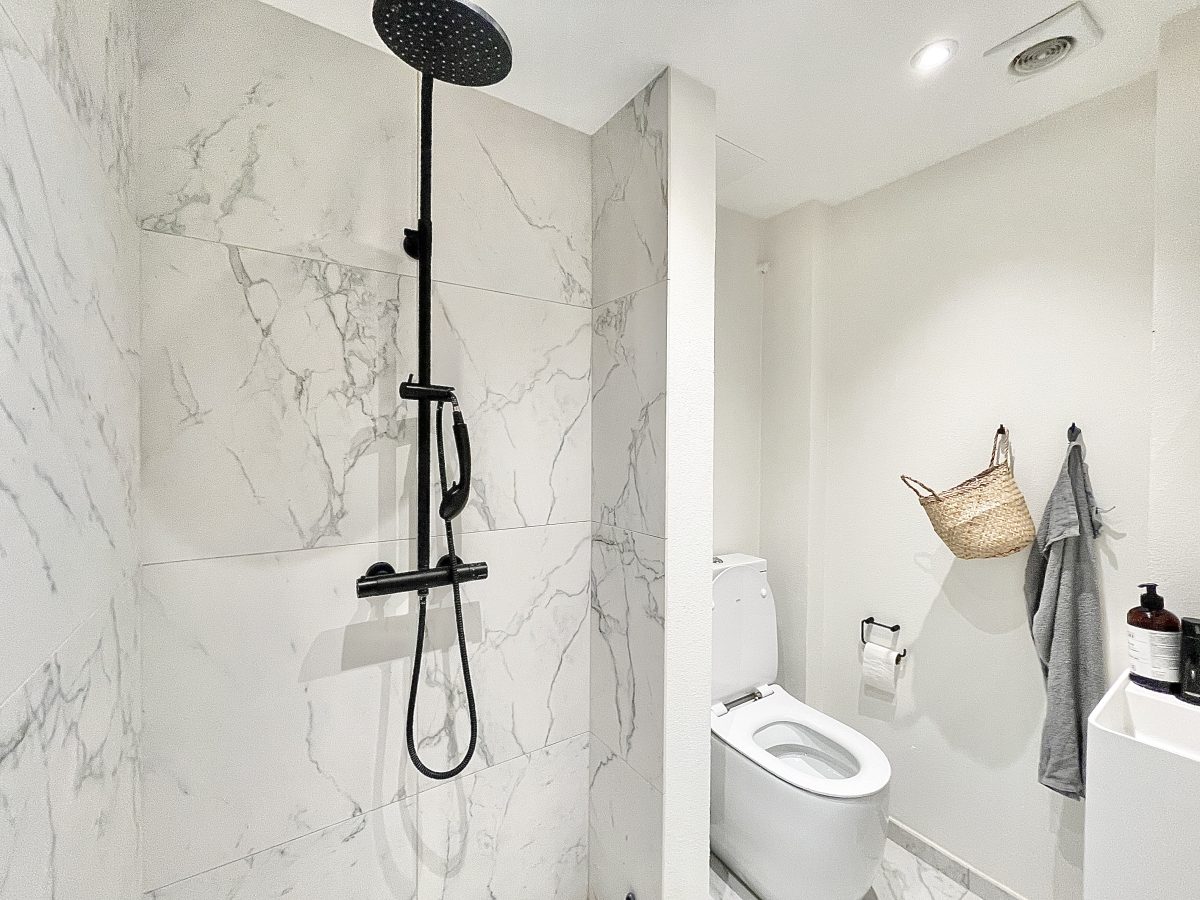 Lejligheden byder velkommen med en praktisk indrettet fordelingsentre med god plads. Badeværelset pænt og funktionelt med både bruseniche, håndvask og toilet.