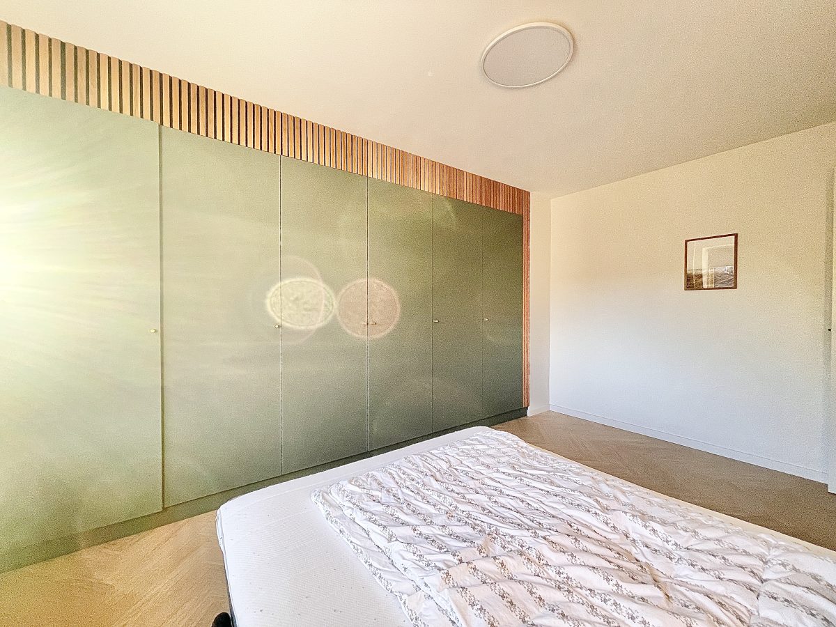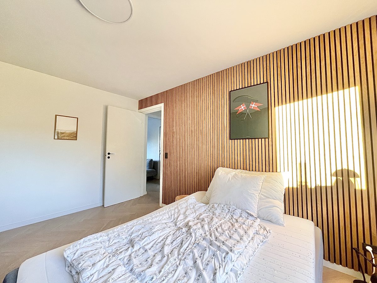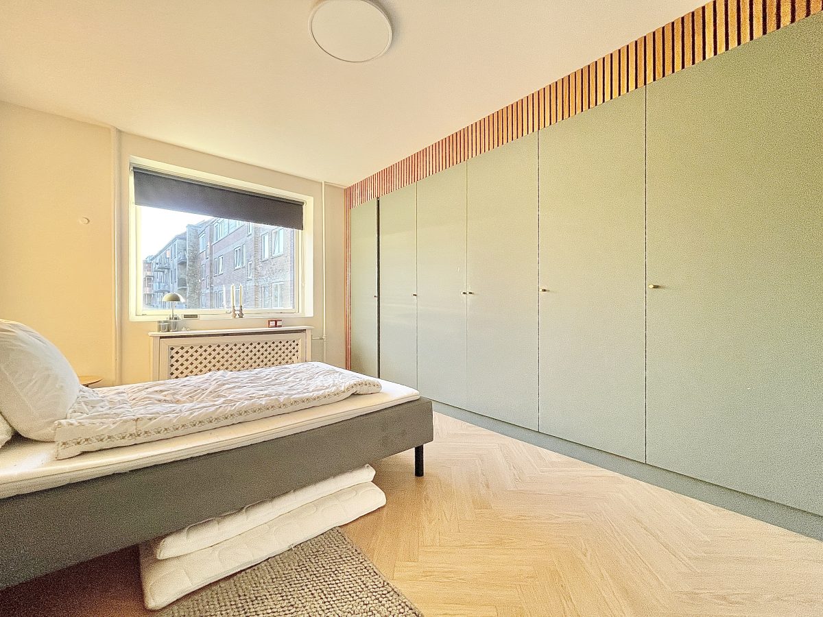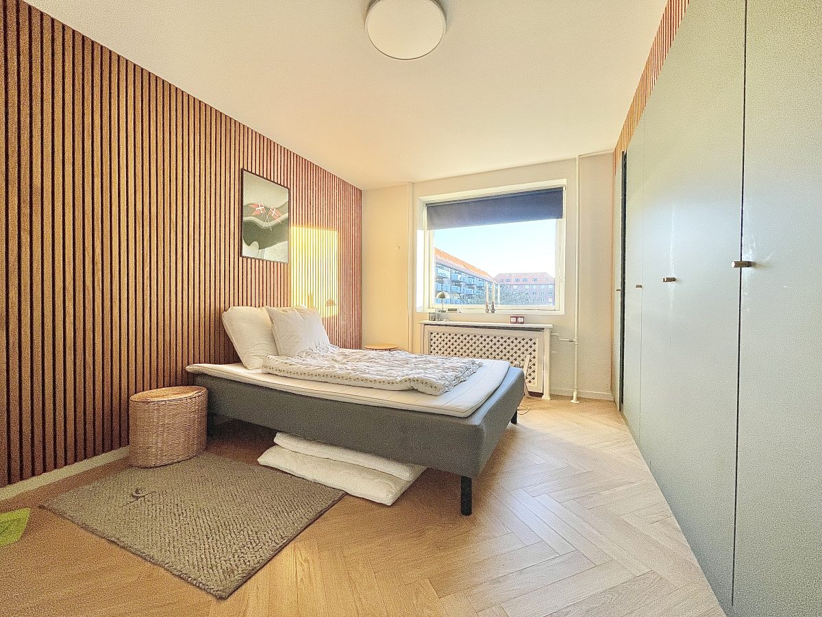 Lejlighedens soveværelse er stort, ligesom at der i lejlighedens store, praktiske og flotte stue er god plads til både sofa og spisebord.