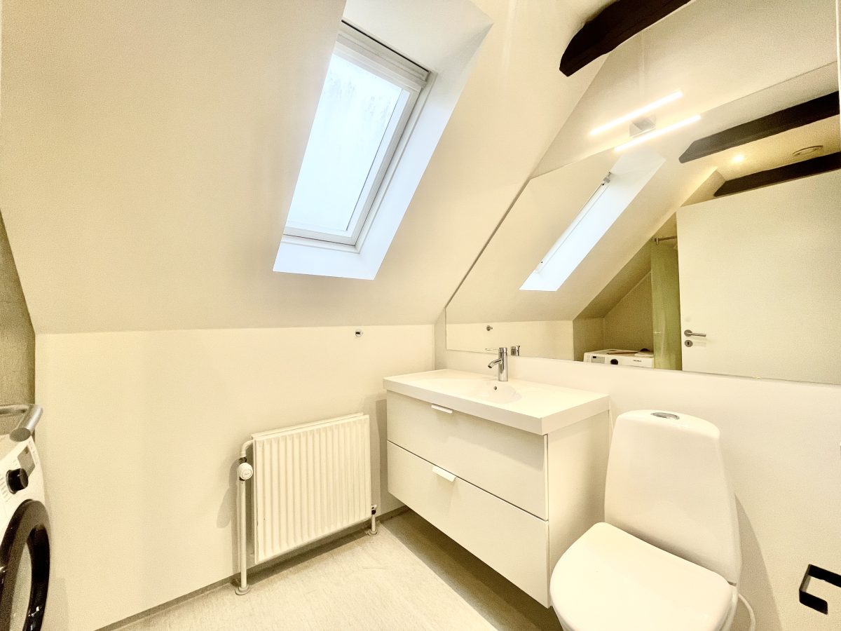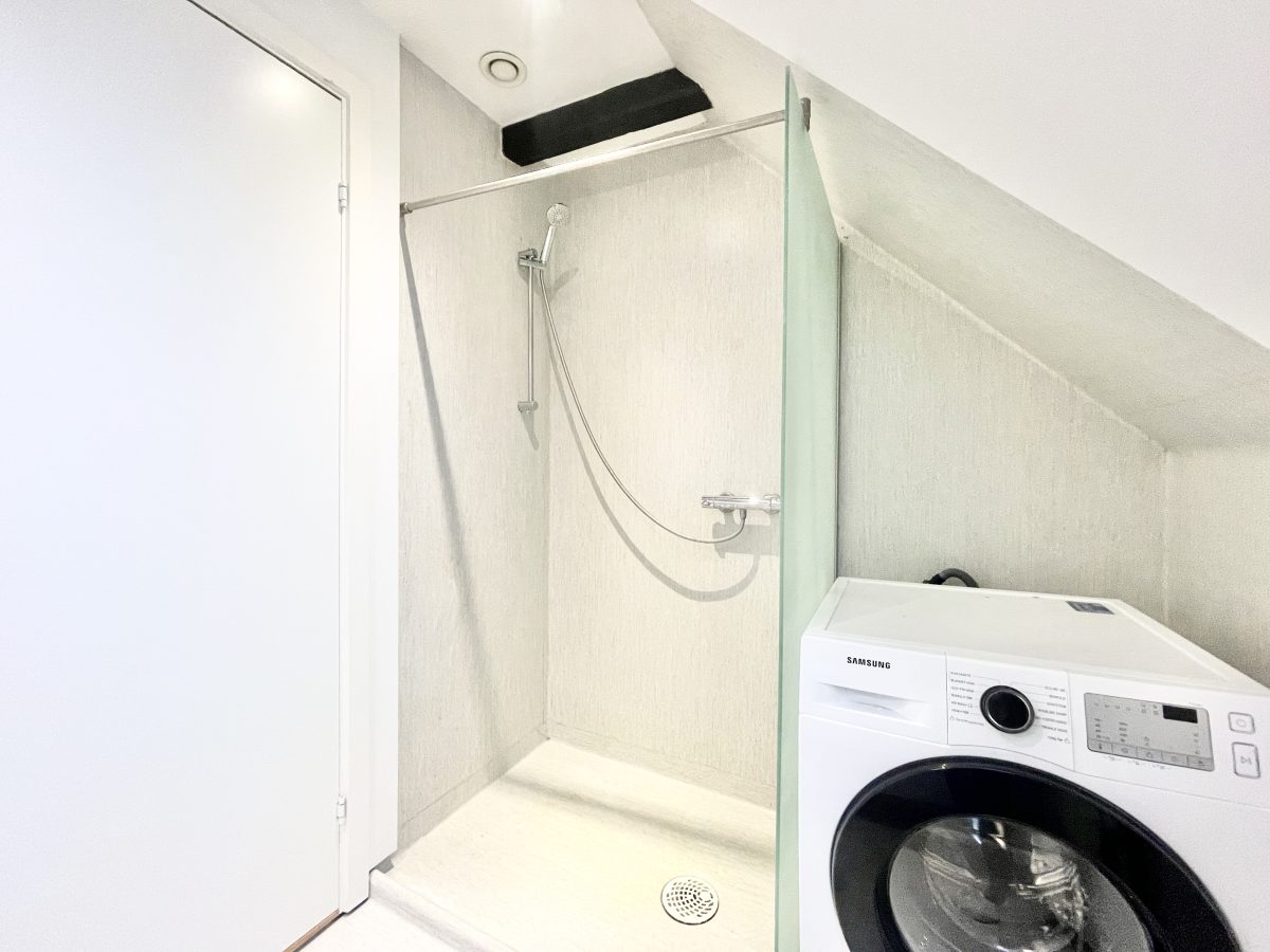 Lejligheden har ydermere et velholdt badeværelse med en rummelig bruseniche og medfølgende vaskemaskine.