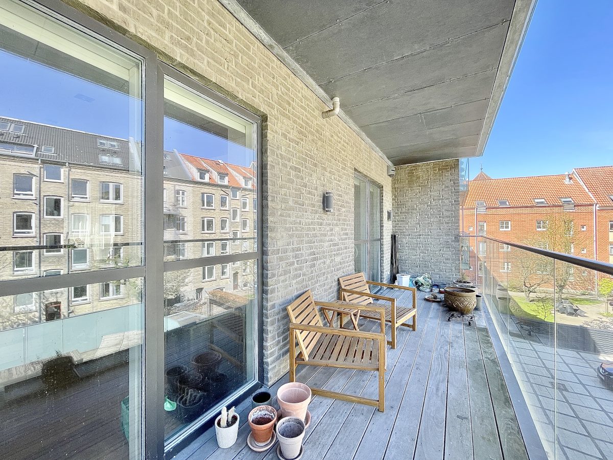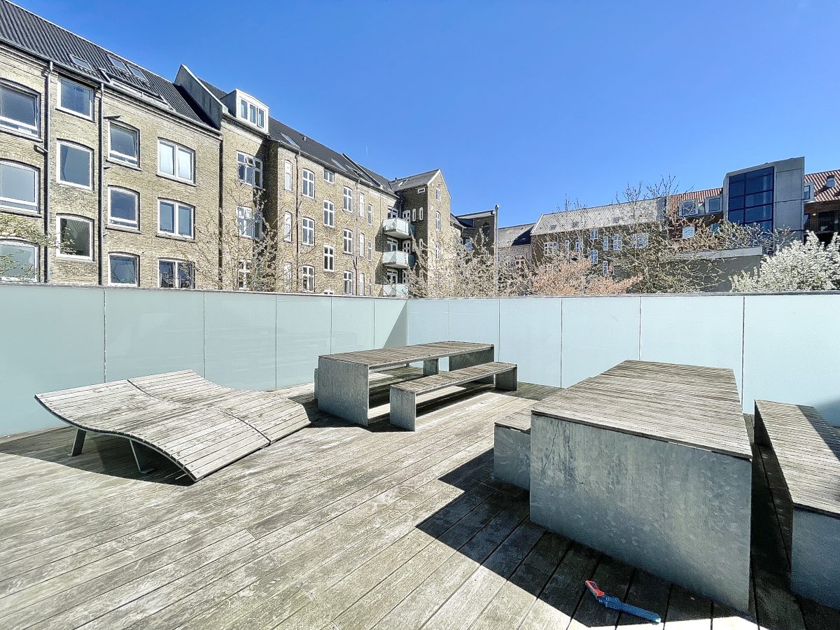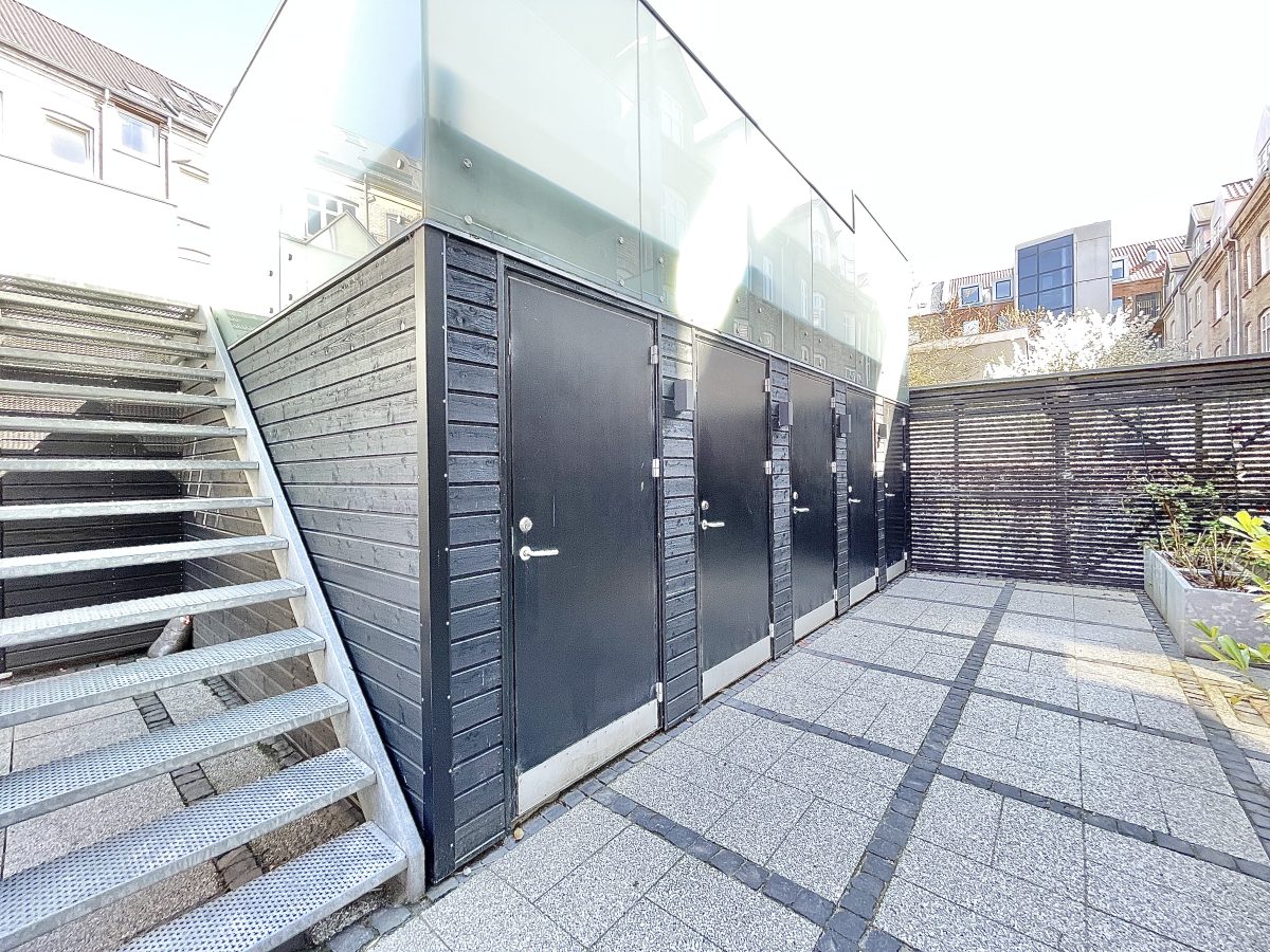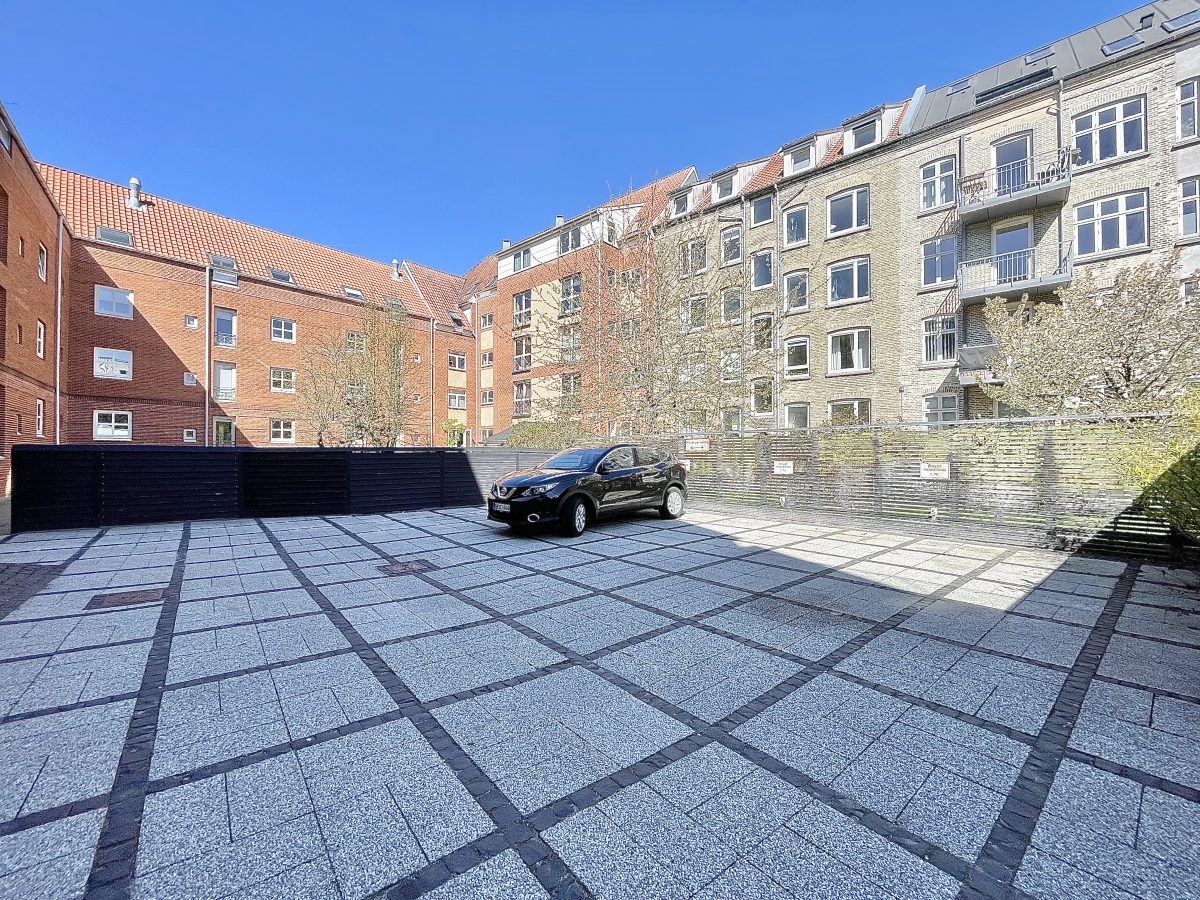 Der hører store og private altaner på 14 kvm til alle boliger, ligesom der ydermere er en fælles tagterrasse på 50 kvm placeret i en flot og stilfuld fælles baggård, der er aflåst med gitterport og udstyret med overvågning. Der er mulighed for tilkøb af egen parkeringsplads i gården til 750 kr. mdn.