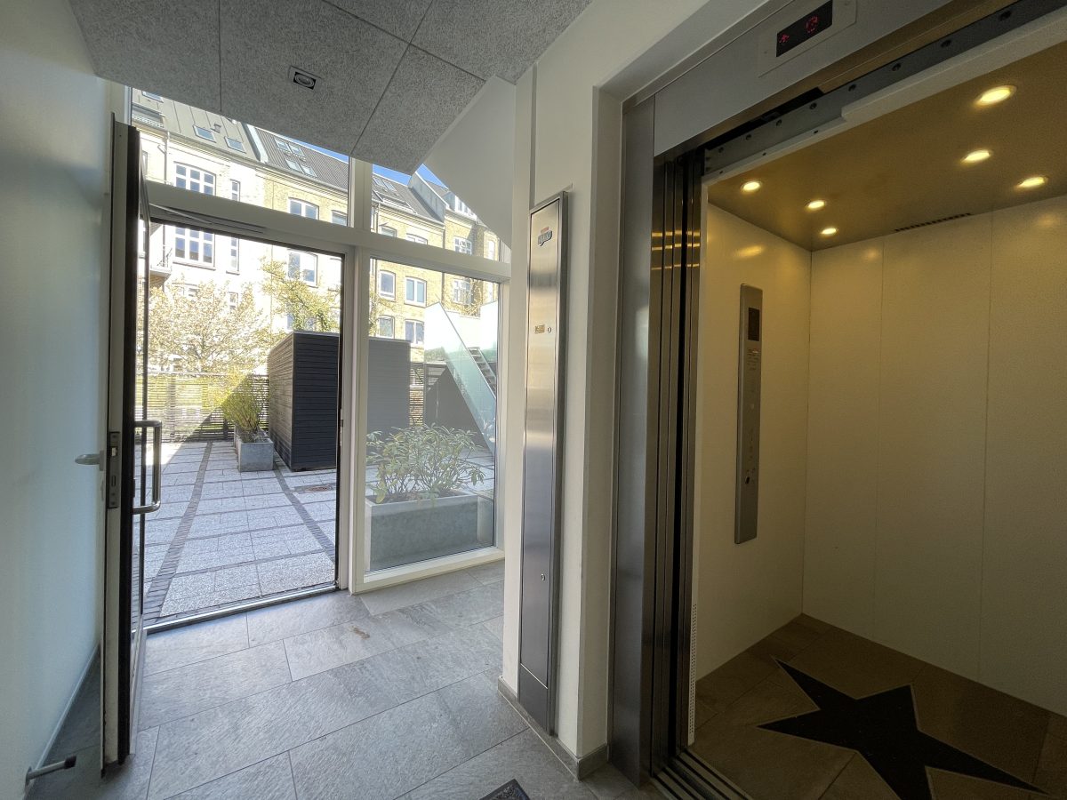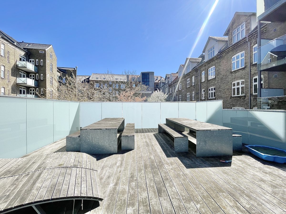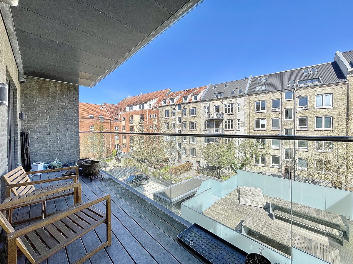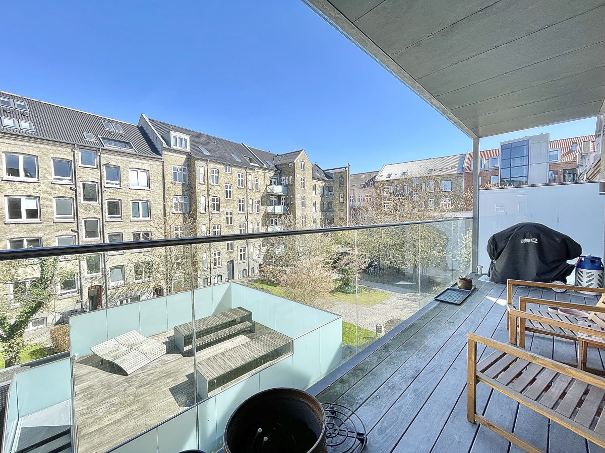 Der hører store og private altaner på 14 kvm til alle boliger, ligesom der ydermere er en fælles tagterrasse på 50 kvm placeret i en flot og stilfuld fælles baggård, der er aflåst med gitterport og udstyret med overvågning. Der er mulighed for tilkøb af egen parkeringsplads i gården til 750 kr. mdn.