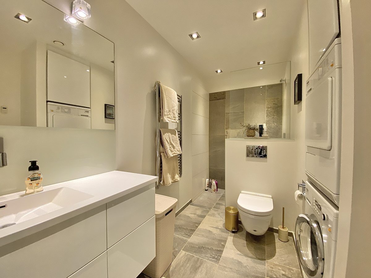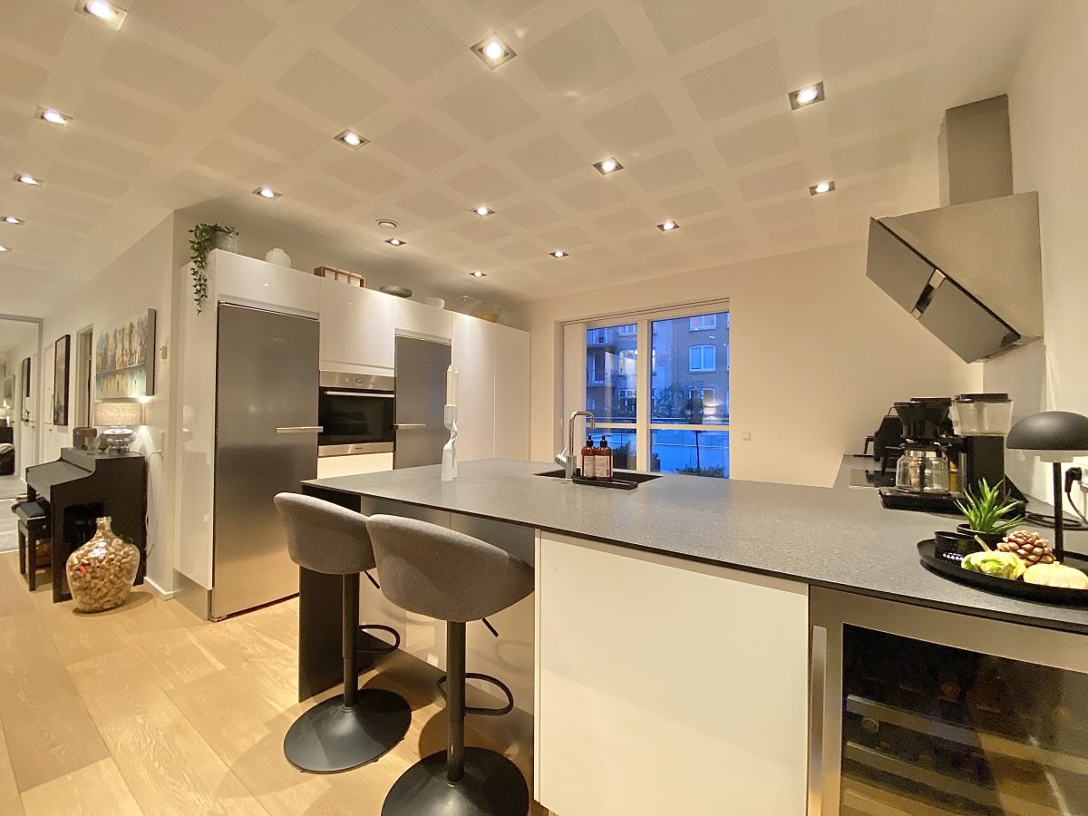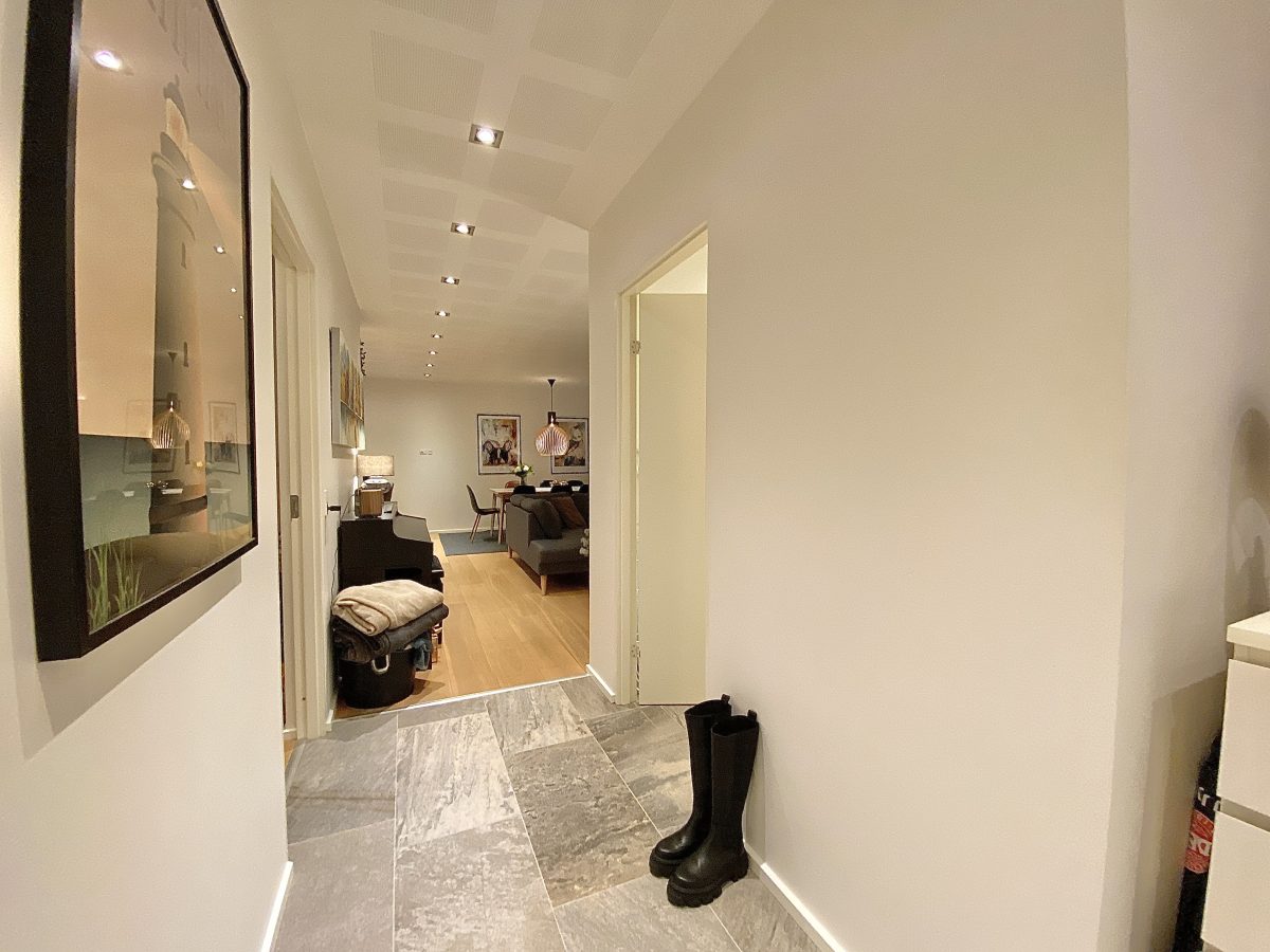 Materialevalget er naturligvis også nøje udvalgt med flotte lyse akustik gipslofter, hvide vægge med filt, flotte trægulve og klinker samt indbygningsspots i hele boligen. Derudover er både køkken- og badeværelsesinventar også i indbydende lyse farver og med mange flotte detaljer.