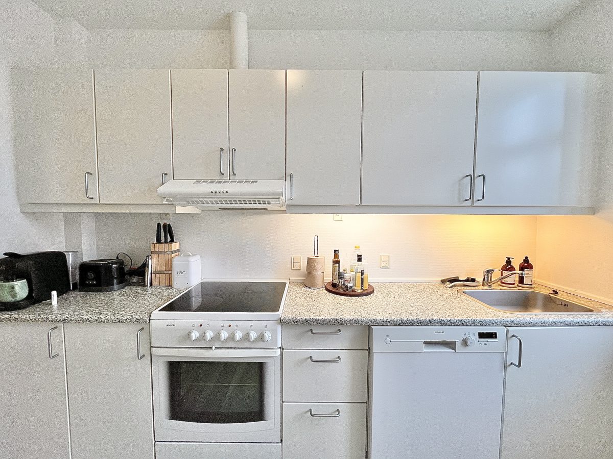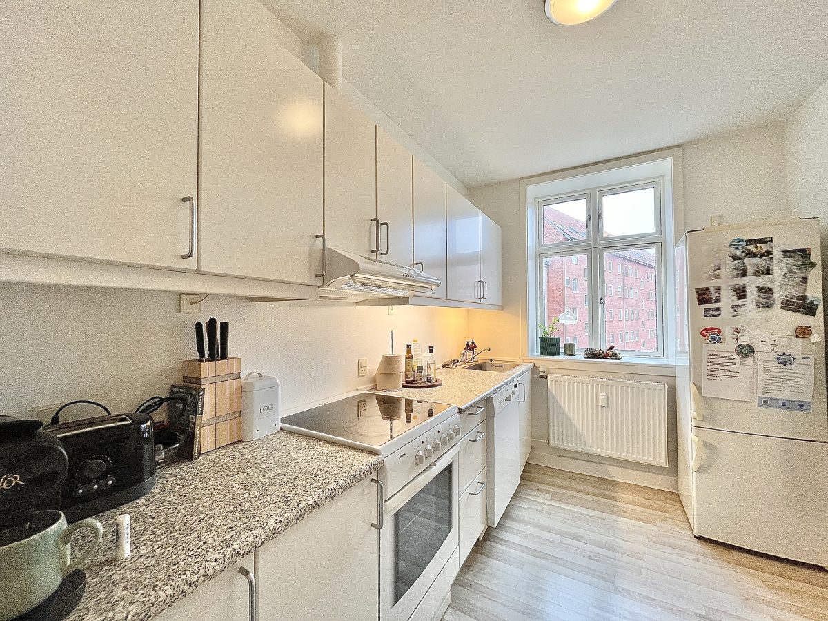 Boligens køkken er lyst og flot og medfølger opvaskemaskine, køle/fryseskab, komfur og emhætte.