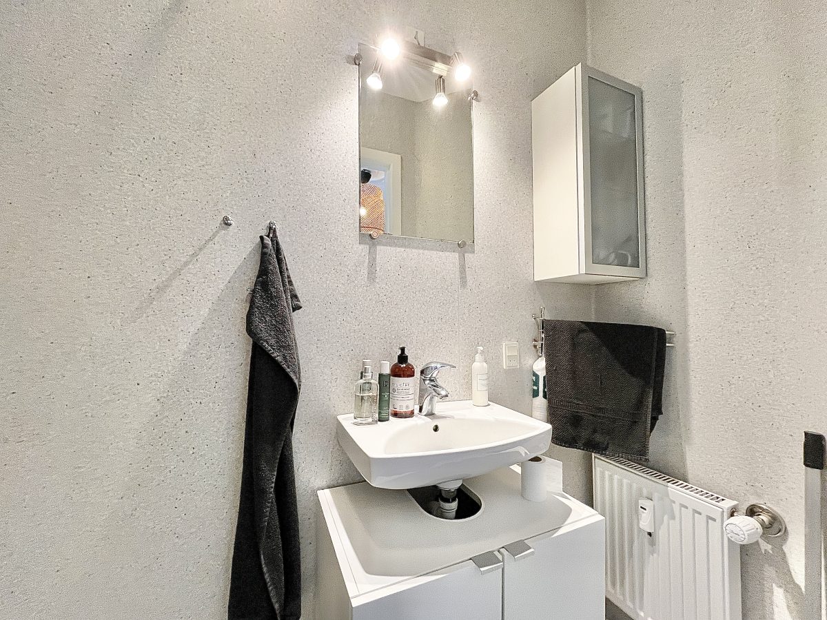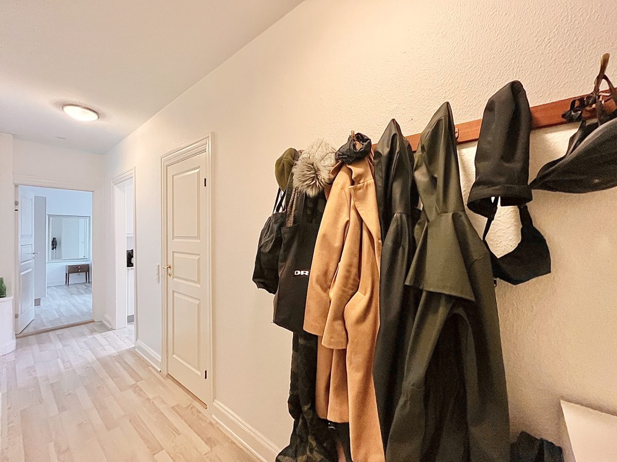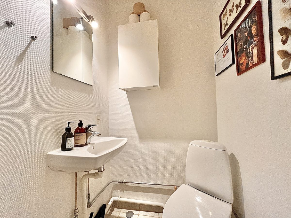 Fra den rummelige fordelingsentré (oplagt til sko & overtøj) er der adgang til lejlighedens toilet.