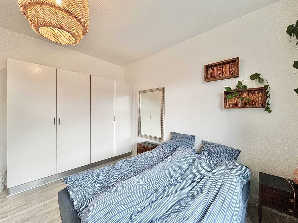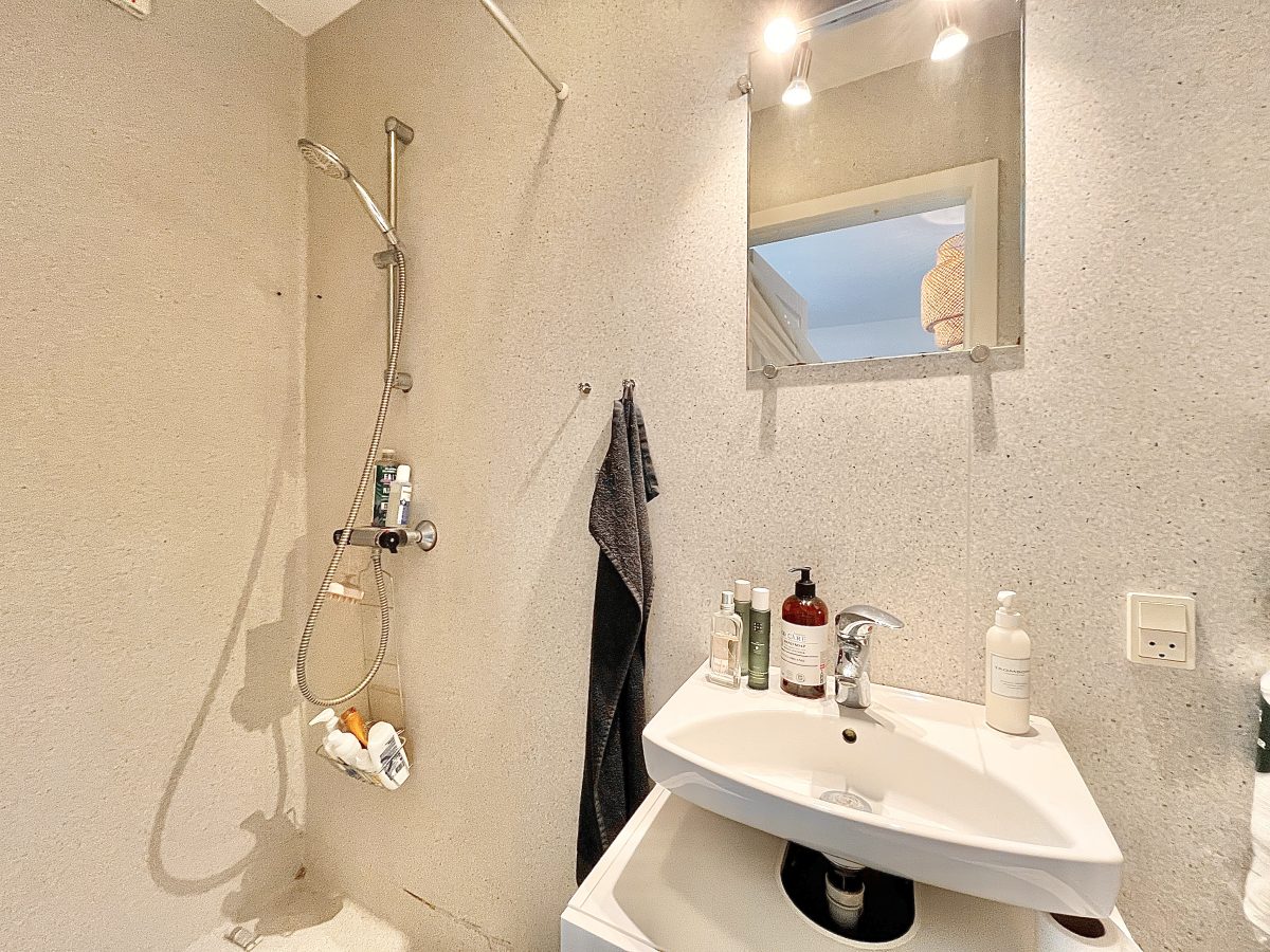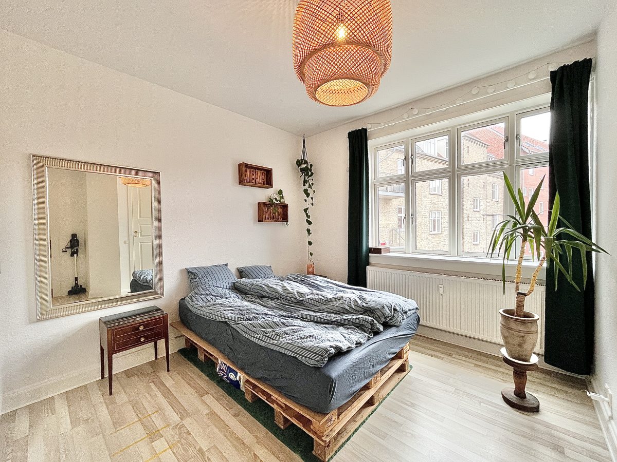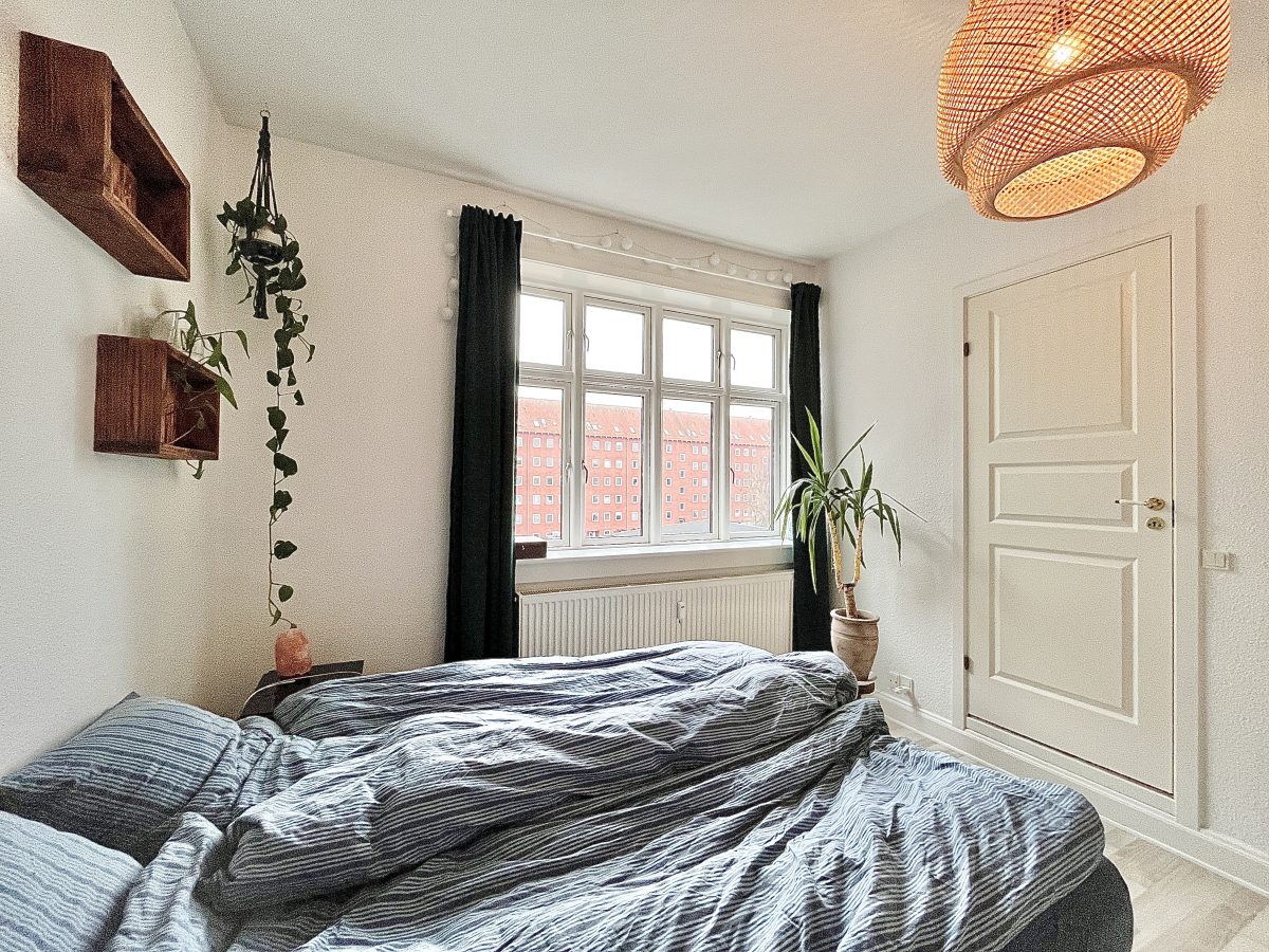Boligens soveværelse har en god størrelse og medfølger en fuld væg med indbyggede skabe. Fra soveværelset er der adgang til boligens badeværelse med separat bruseniche.