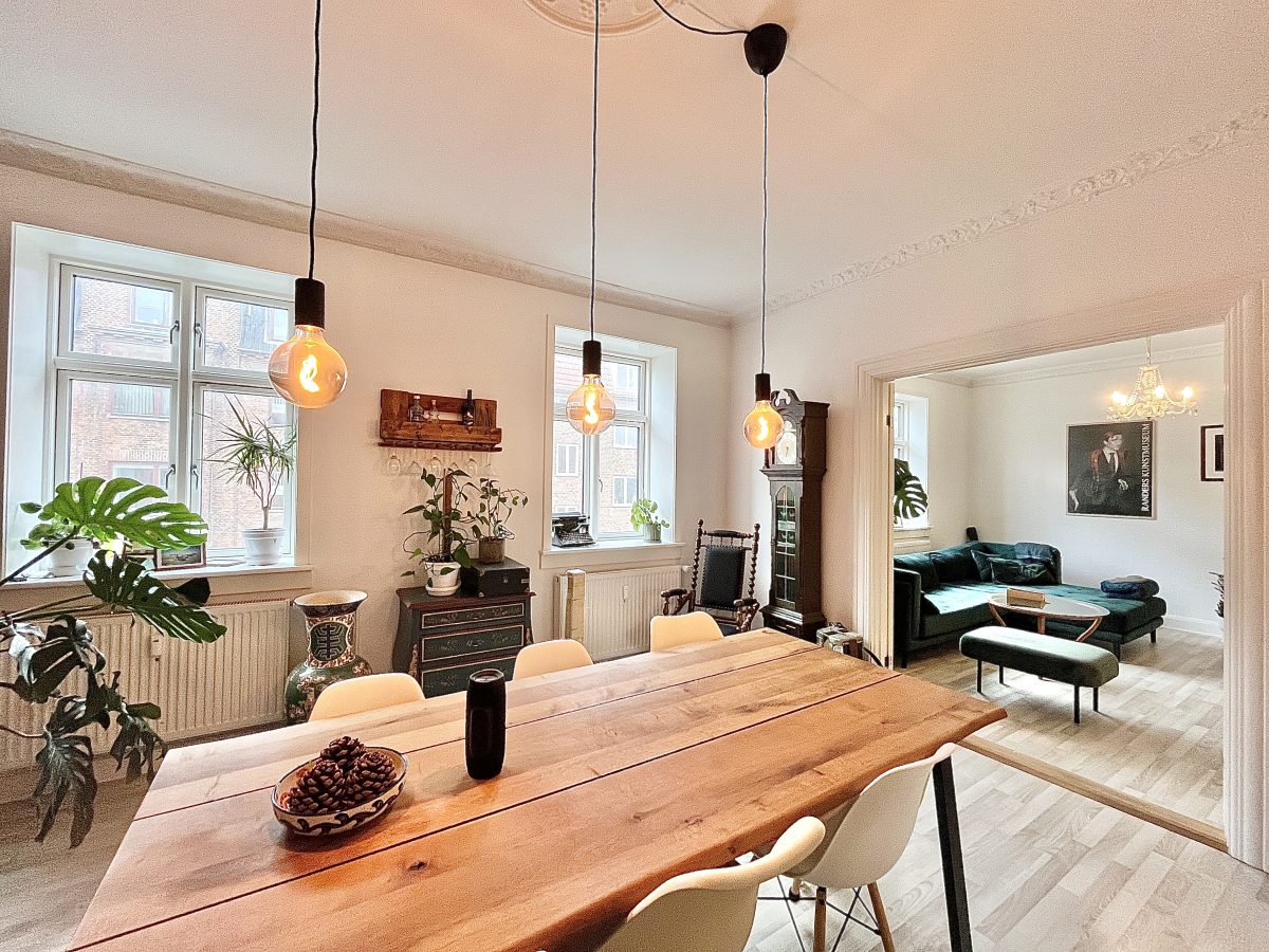 Dobbeltstuen er ligeledes godt udnyttet - og her er der fin plads til spisebord og sofaarrangement.