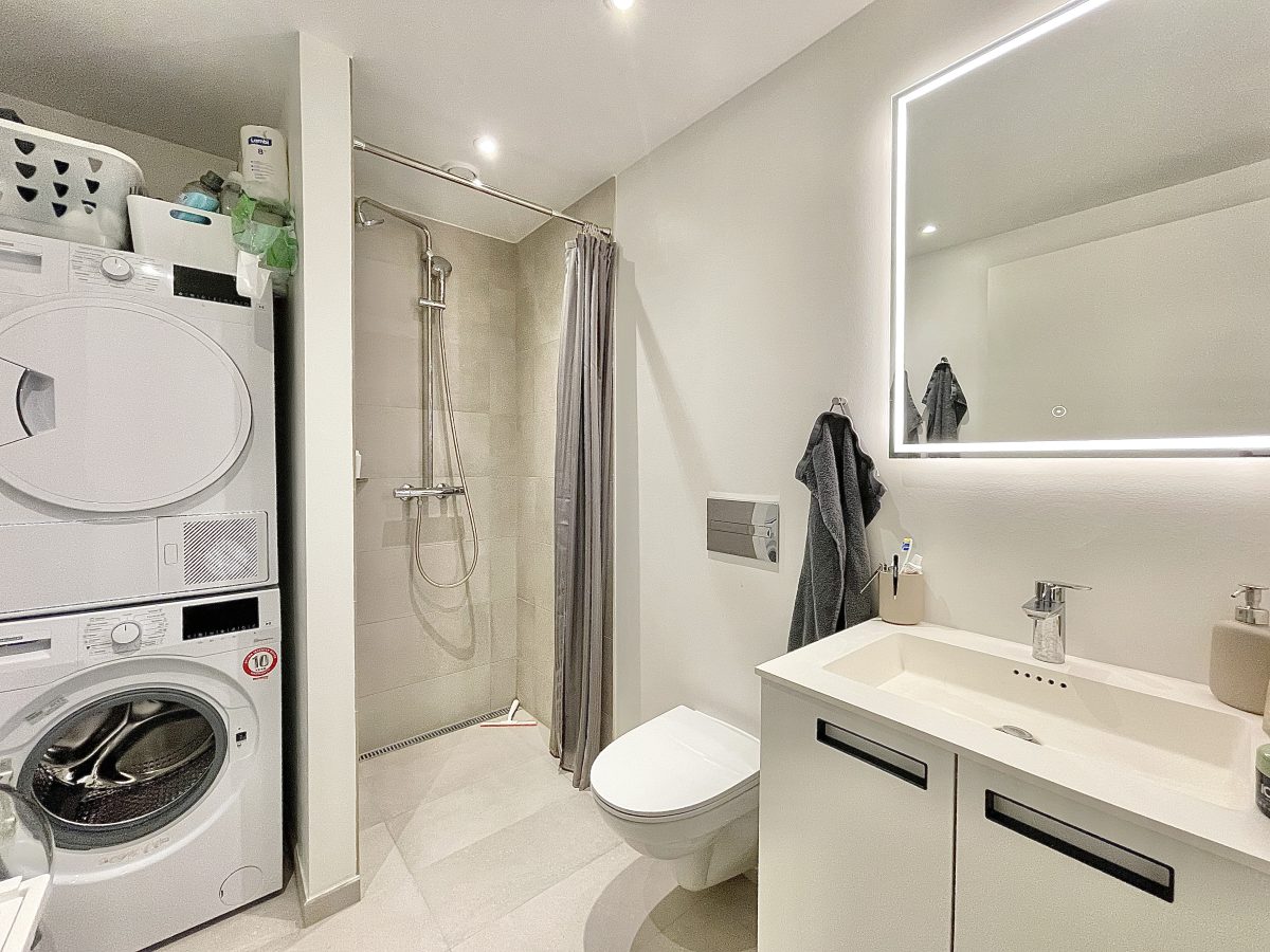 Badeværelset er rummeligt og har medfølgende vaskesøjle - mens der her (ligesom i resten af boligen) er gulvvarme og moderne ventilationsanlæg.