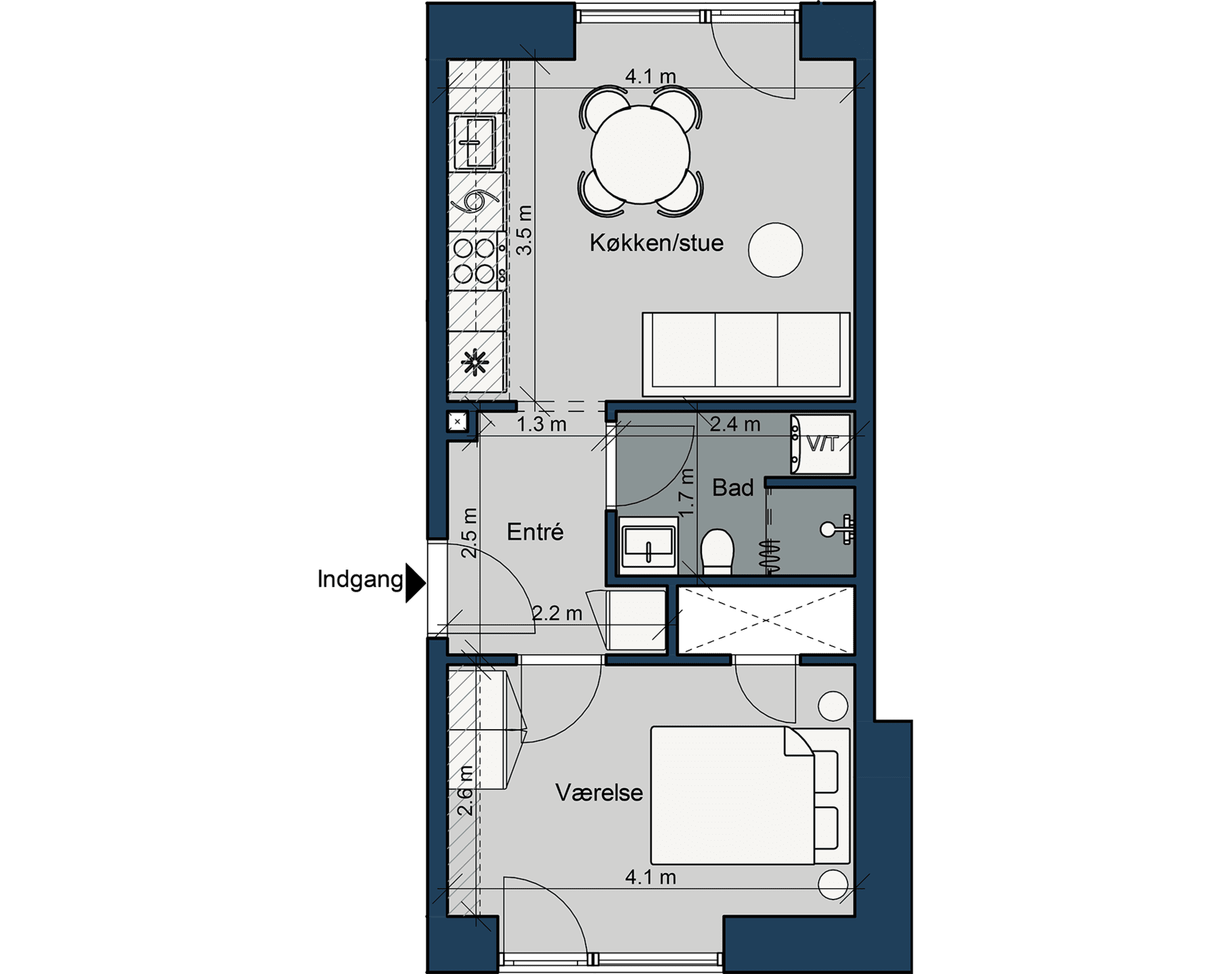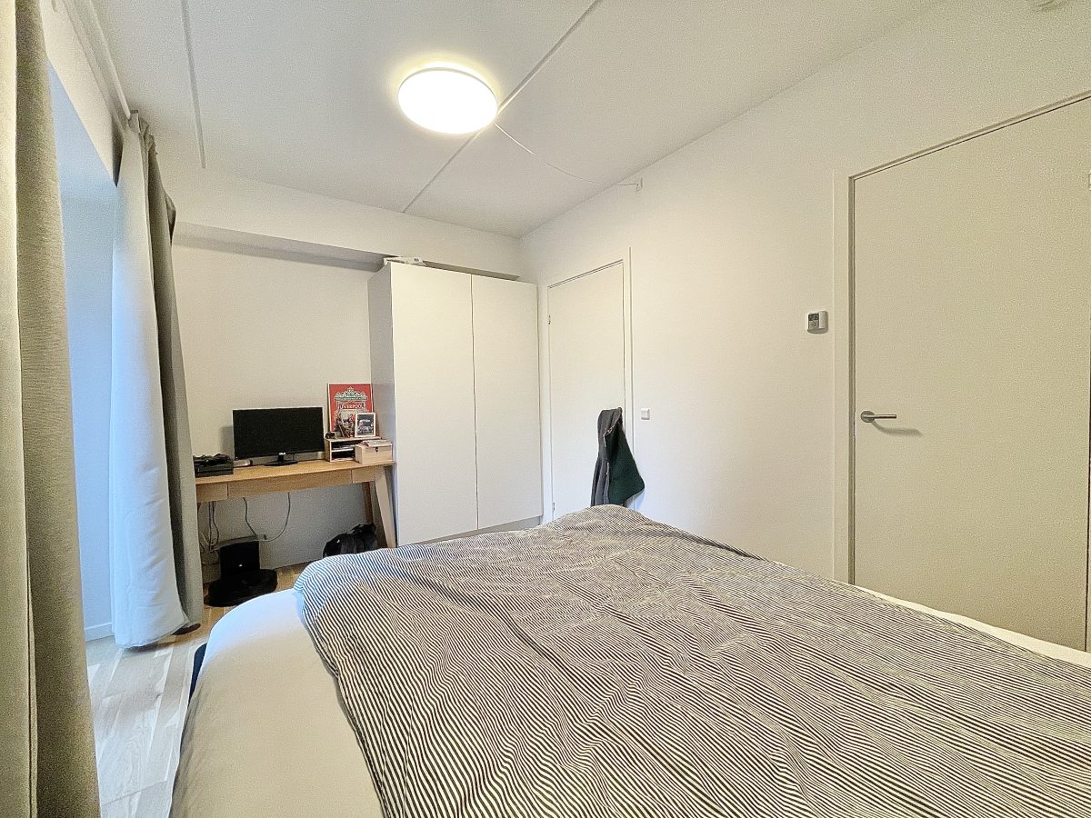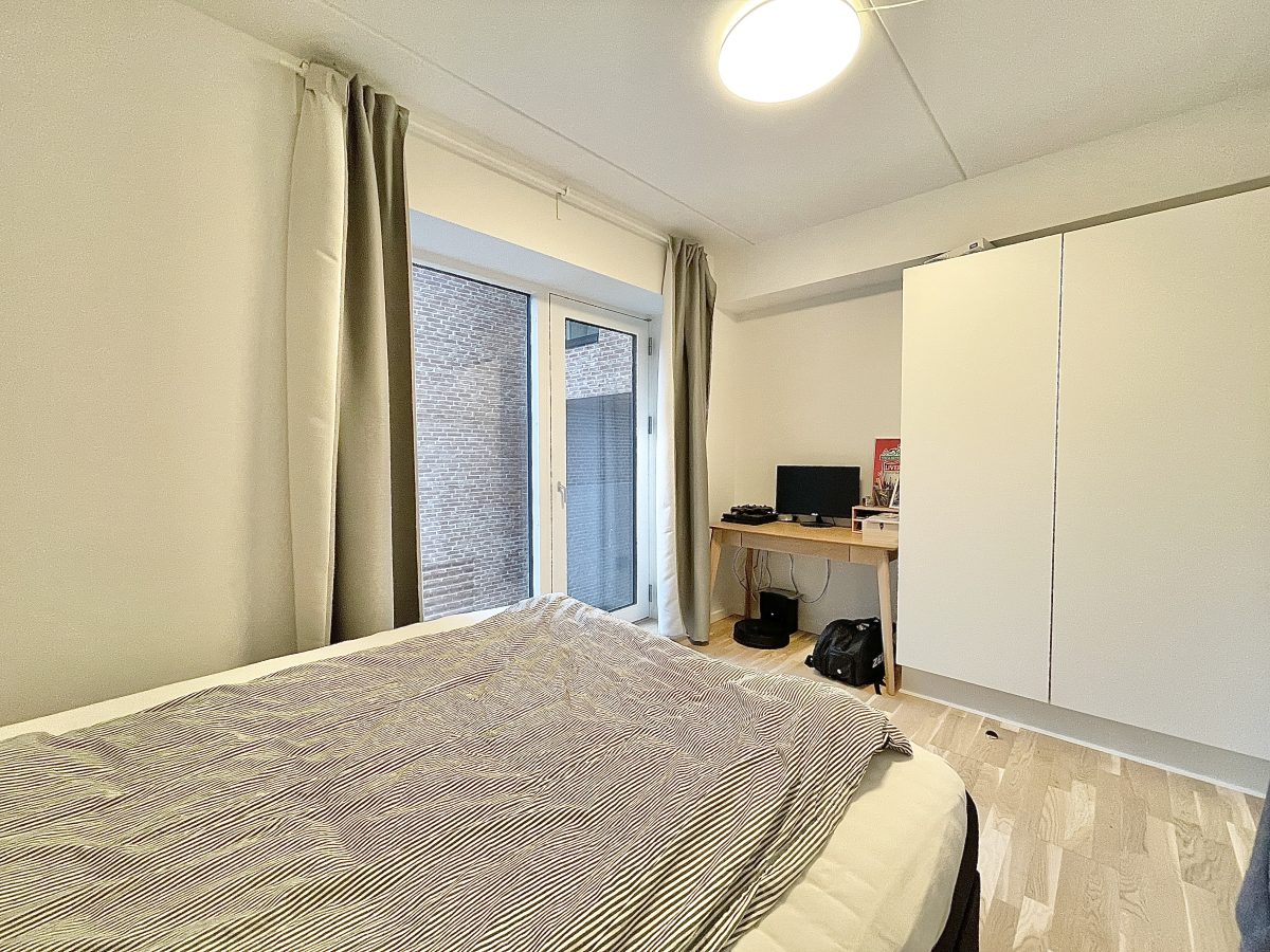 Soveværelset har fin plads til både seng og skrivebord - mens der ligeledes er praktiske indbyggede skabe.