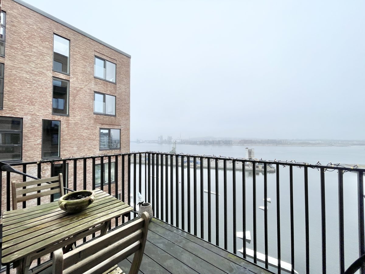 Lejligheden byder på et flot, lyst køkken fra Svane med alle hvidevarer fra Blomberg. Fra det åbne køkken-alrum er der direkte adgang til boligens store altan m. fjordudkig.