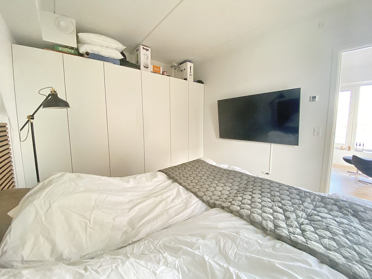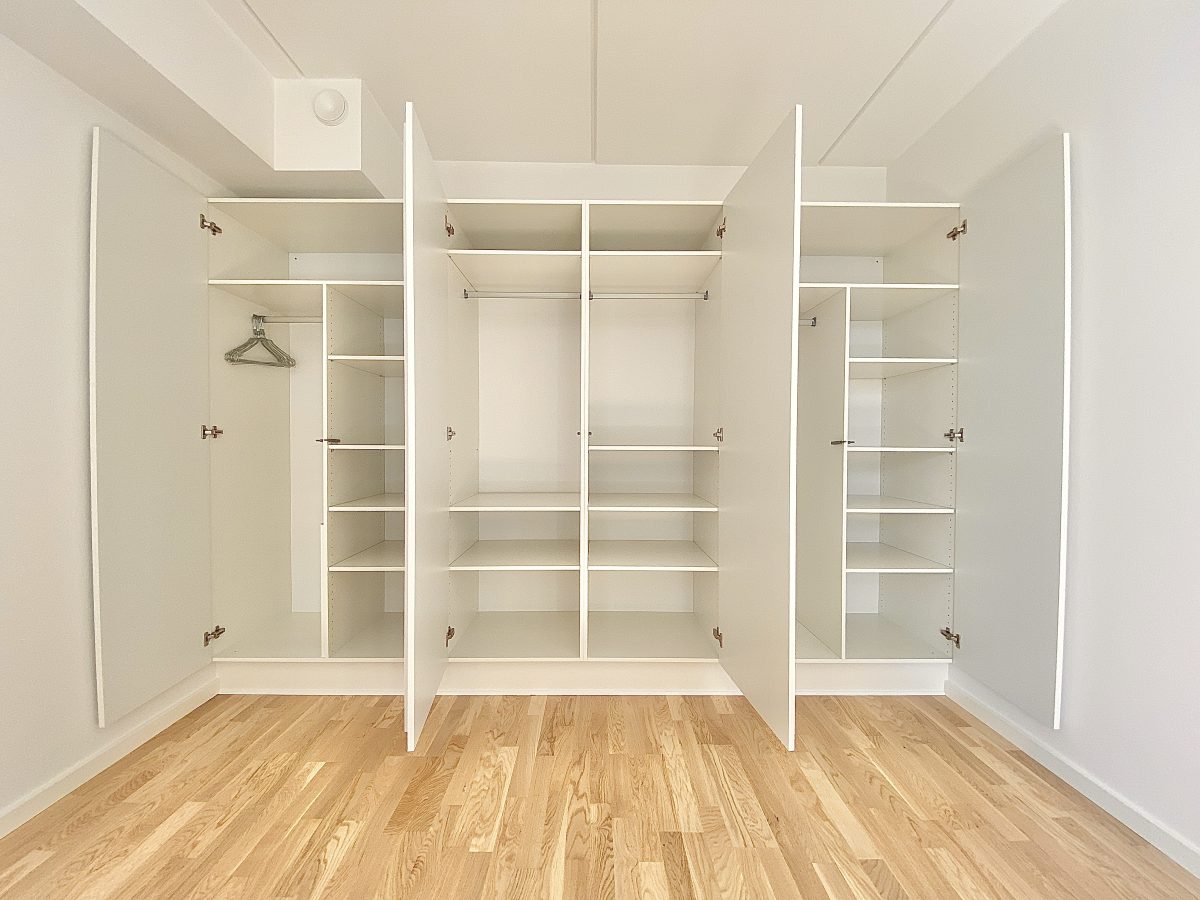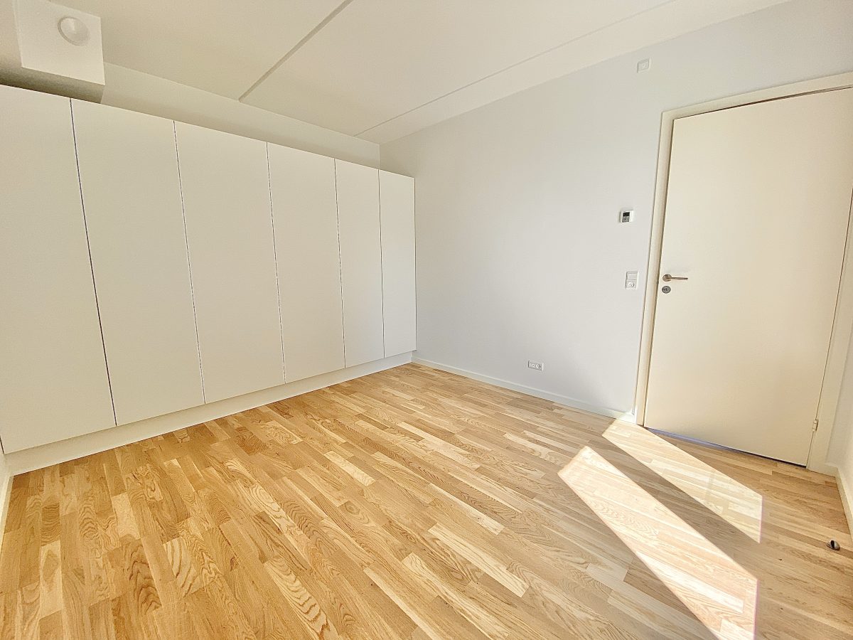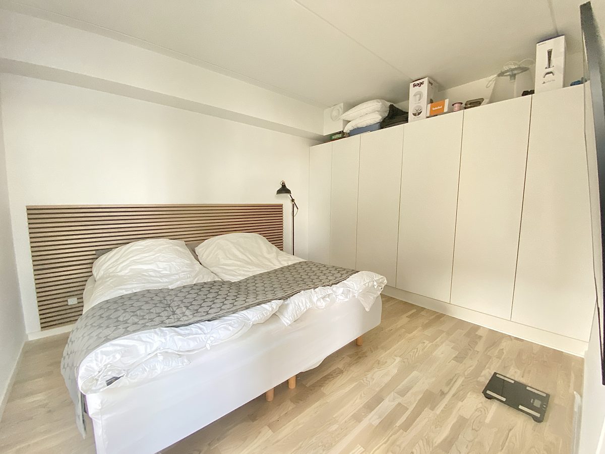 Soveværelset kommer ligeledes med god plads til både seng og sengeborde - mens der også venter en hel væg med indbyggede skabe til dig!