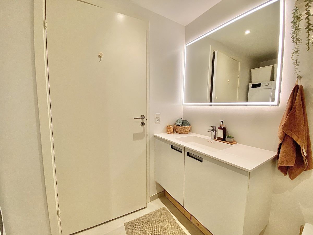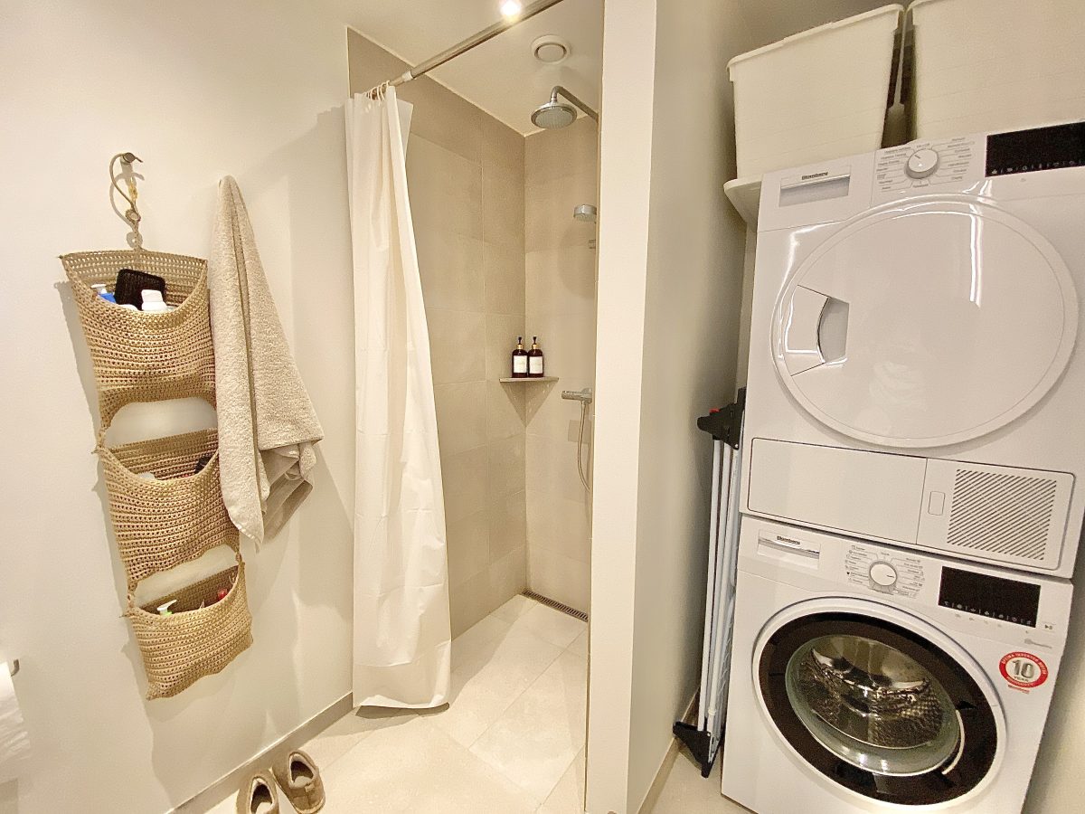 Lejligheden har en fin og praktisk entré, hvor der er oplagt plads til sko og overtøj. Fra entréen er der adgang til lejlighedens flotte badeværelse med stor bruseniche og vaskesøjle.