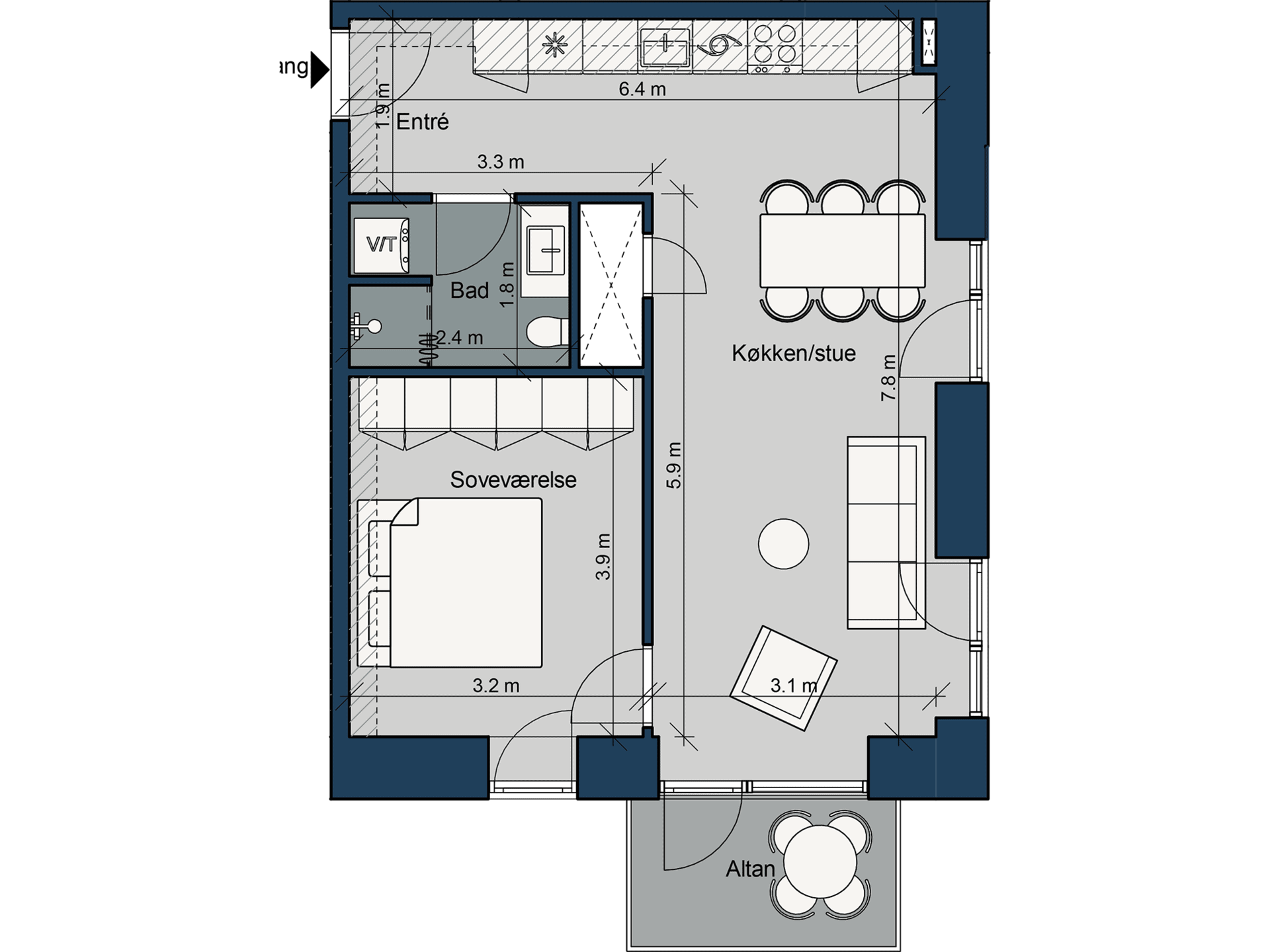 Stuen er lang og lys - og giver fin plads til spisebord, sofa og fjernsyn. Fra stuen er der ligeledes adgang til boligens store altan.