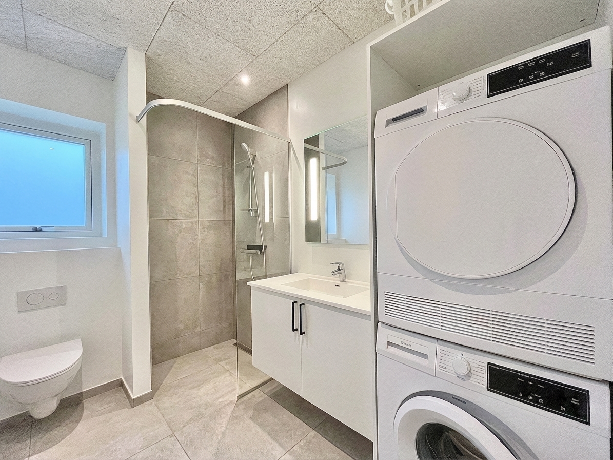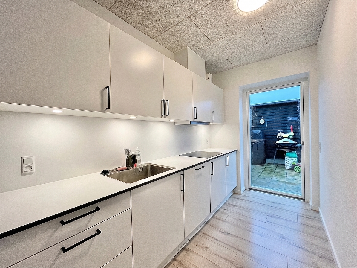 Hjemmet fremstår lyst og indbydende med et åbent opholdsrum. De store vinduespartier sikrer et flot lysindfald, som skaber en behagelig atmosfære i hele boligen. Køkkenet er moderne og stilrent med gode opbevaringsmuligheder og alt, hvad du har brug for i hverdagen.