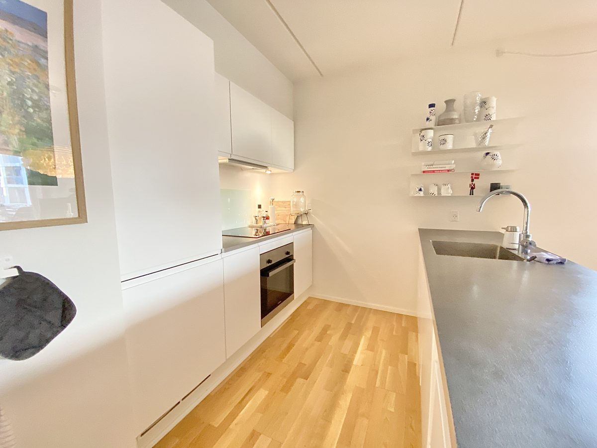 Lejlighedens store og lyse køkken kommer med alt i hvidevarer - og er godt placeret i forhold til den store stue, der har adgang til en stor, sydvendt altan.