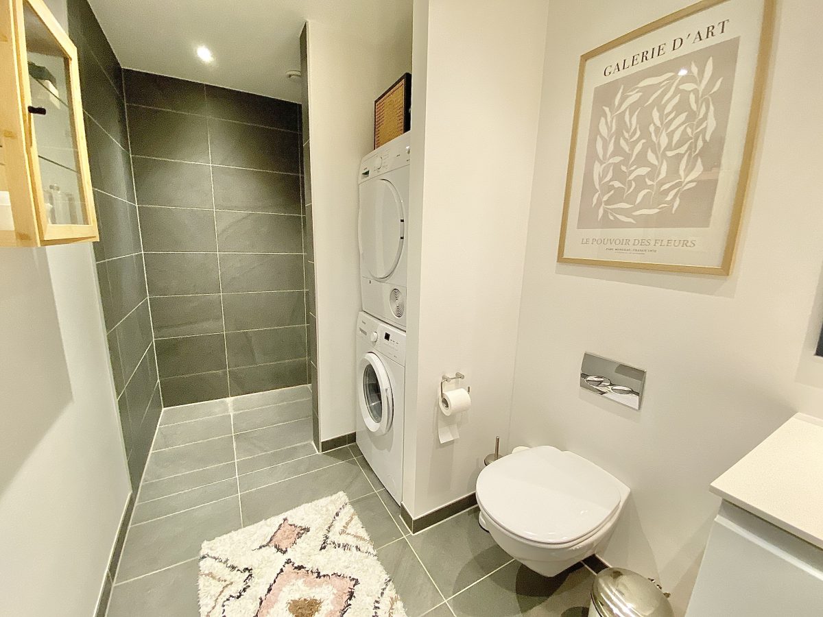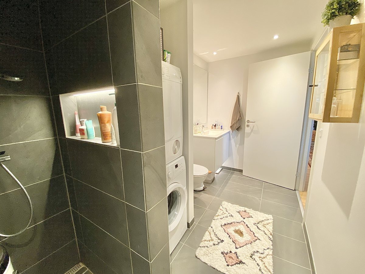 Badeværelset er stort og med vaskesøjle og har - som resten af boligen - gulvvarme og ventilationsanlæg.