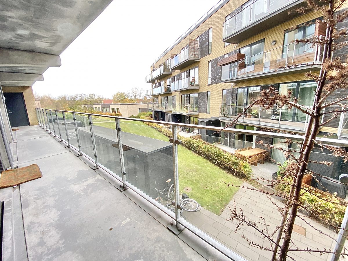 Den store, sydvendte altan er oplagt til de varme sommerdage. Denne er der også adgang til fra lejlighedens soveværelse.