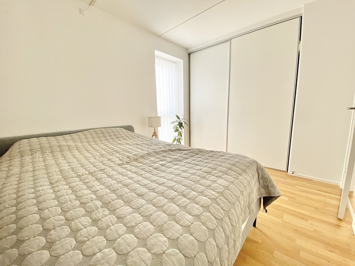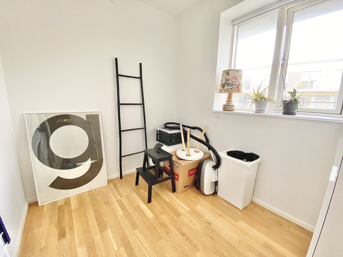 Soveværelset har ligeledes god plads til både seng og sengeborde og kommer med indbyggede skabe. Ekstraværelset kommer ligeledes med et indbygget skab - og kan oplagt benyttes som børneværelse, træningsrum eller kontor.