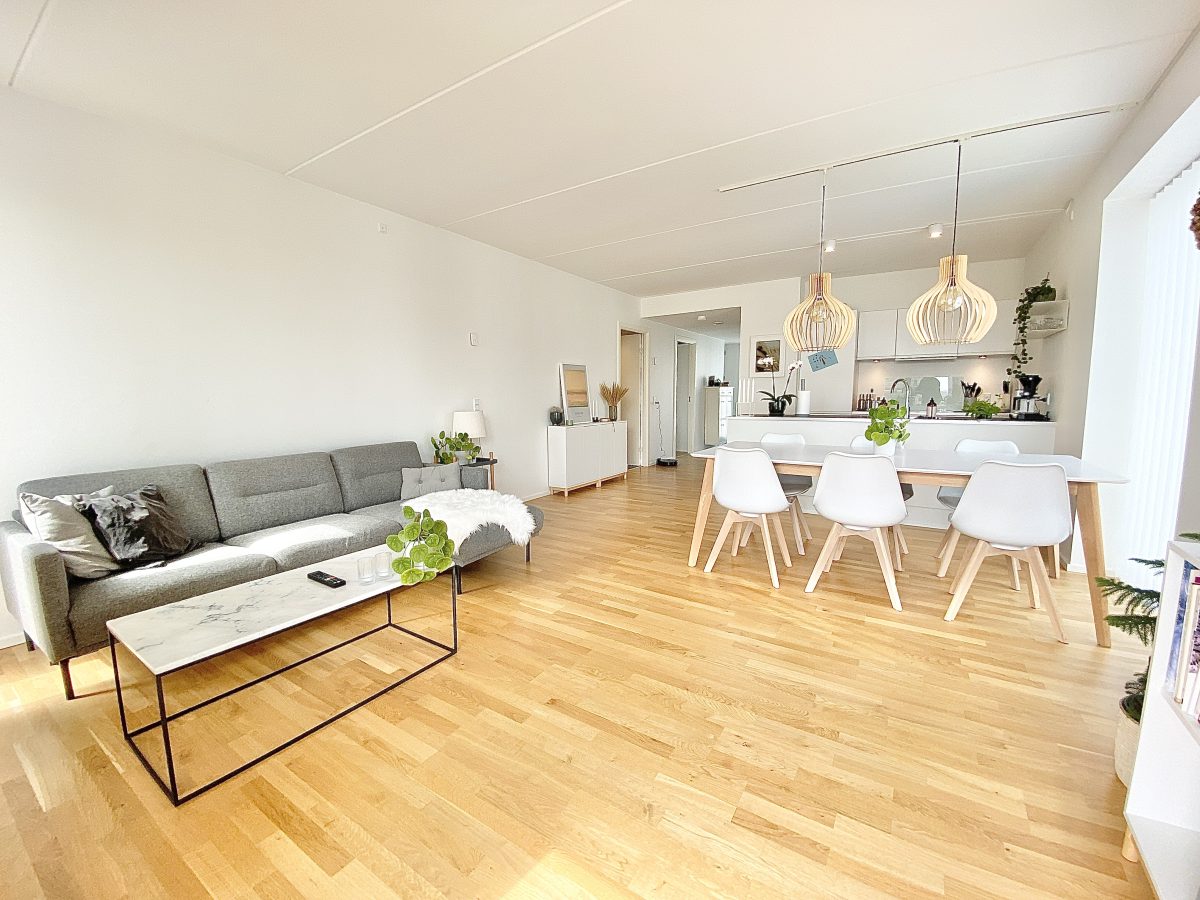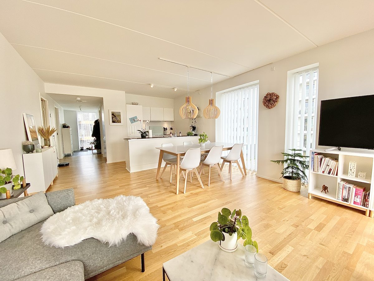 Fra køkkenet er der adgang til boligens lyse stue, der har adgang til altanen, hvor mange solrige timer kan bruges.