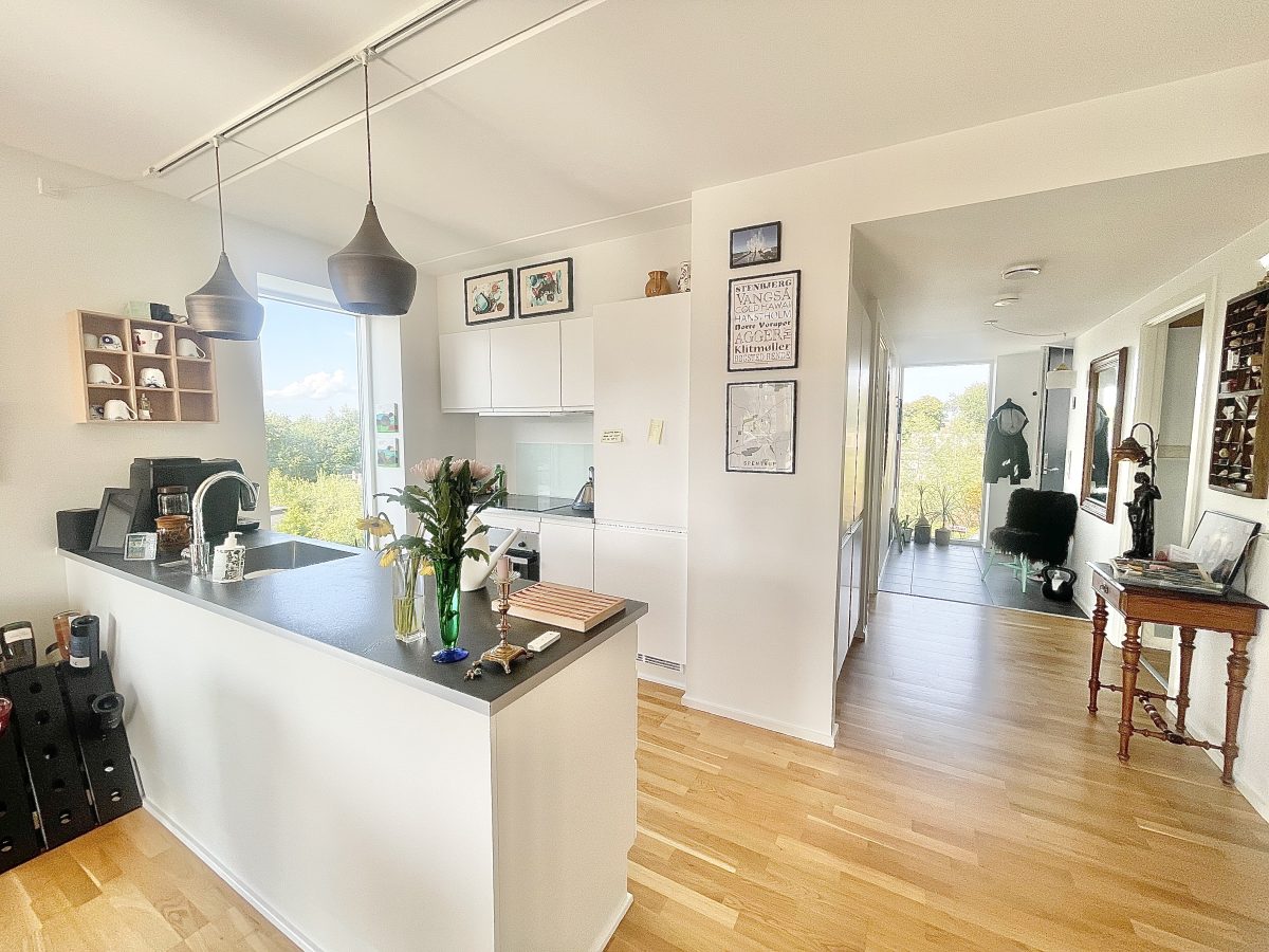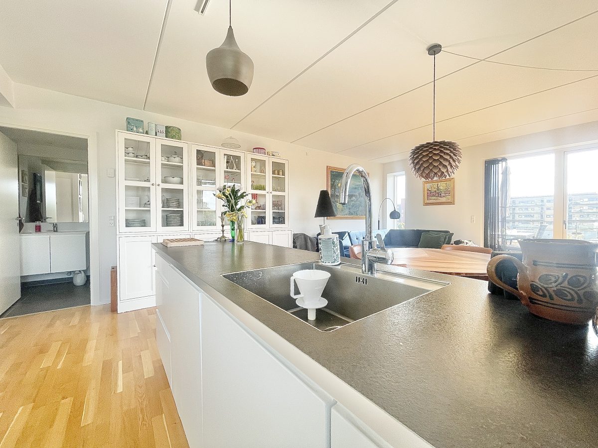 Lejlighedens køkken er lyst og moderne, udstyret med alle nødvendige hvidevarer og en praktisk køkkenø, der giver ekstra skabsplads.