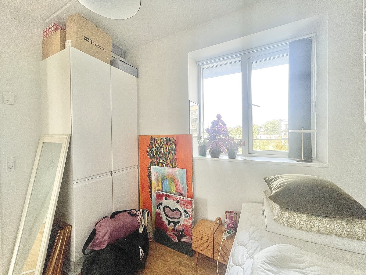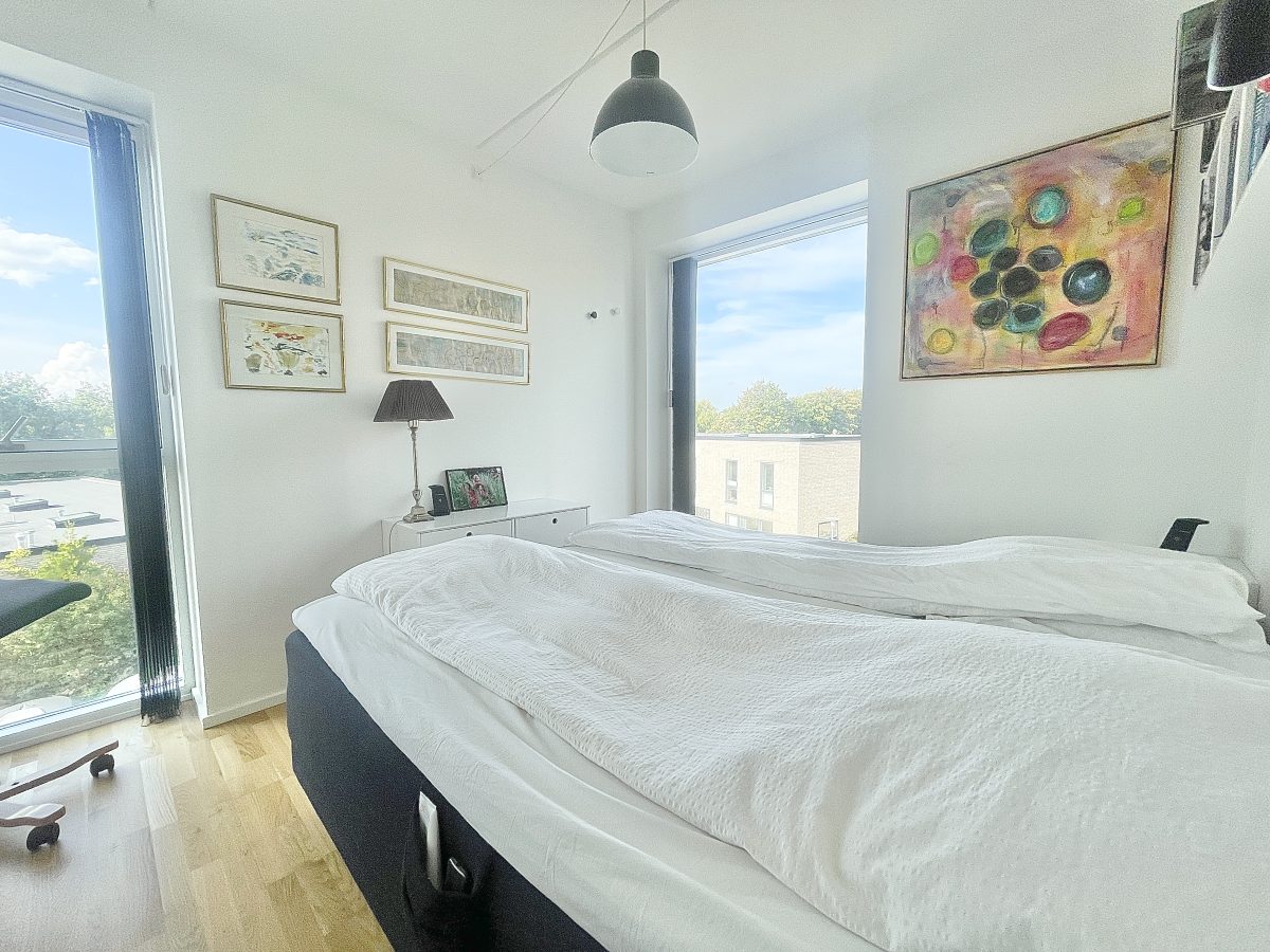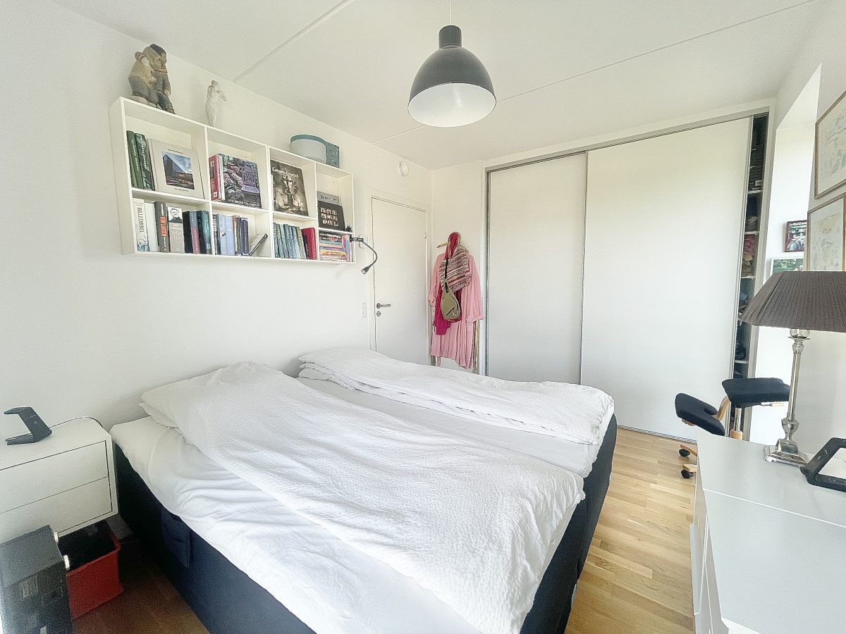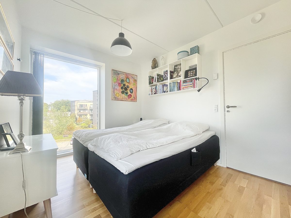 Soveværelset har god plads til seng og sengeborde og er udstyret med indbyggede skabe. Det ekstra værelse har også skabsplads og kan nemt bruges som børneværelse, kontor eller træningsrum.