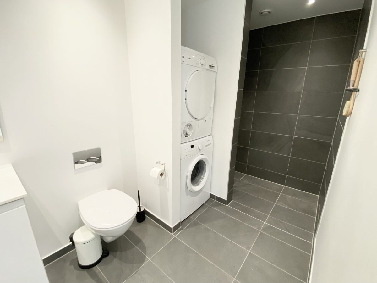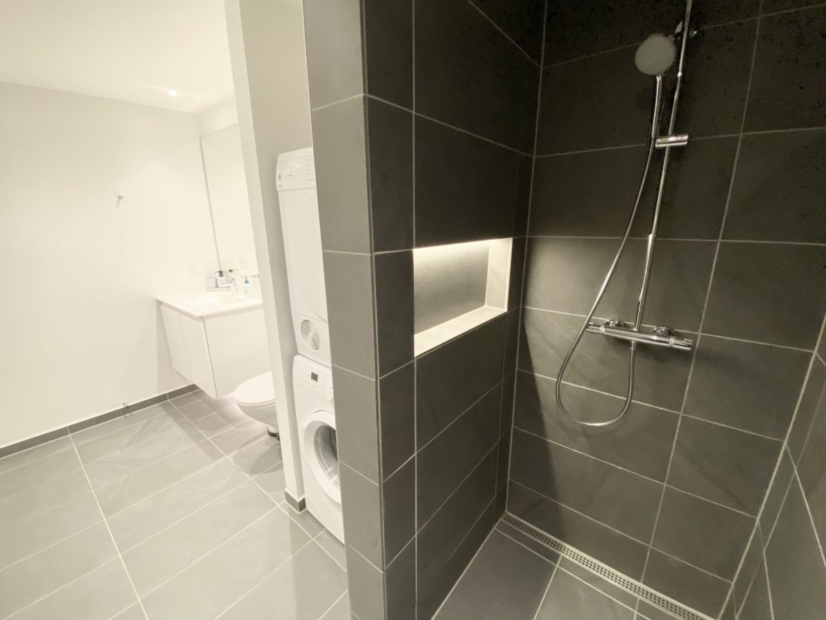 Badeværelset er rummeligt og indrettet med separat bruseniche samt vaskesøjle. Ligesom resten af boligen er der behagelig gulvvarme og et effektivt ventilationsanlæg.