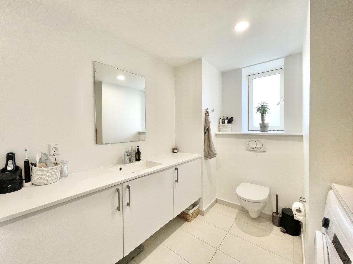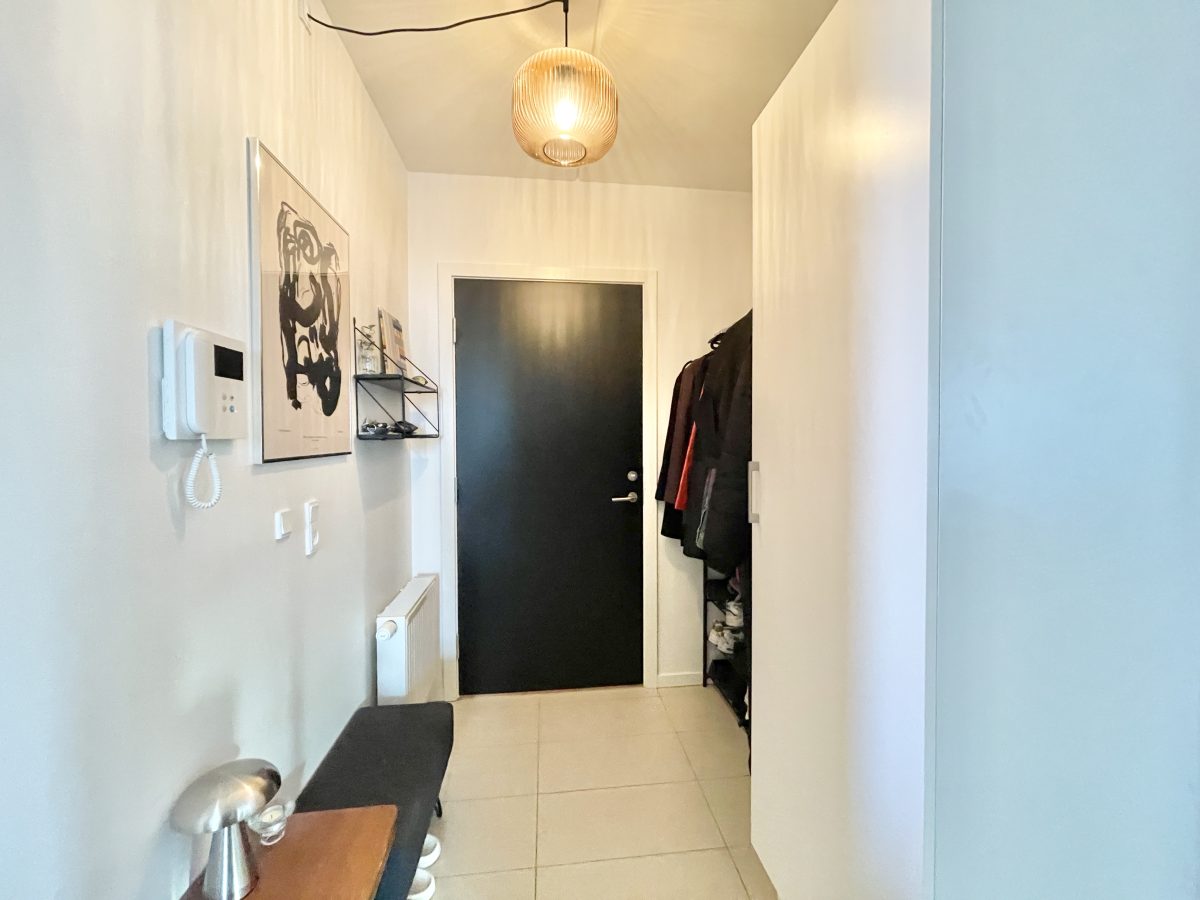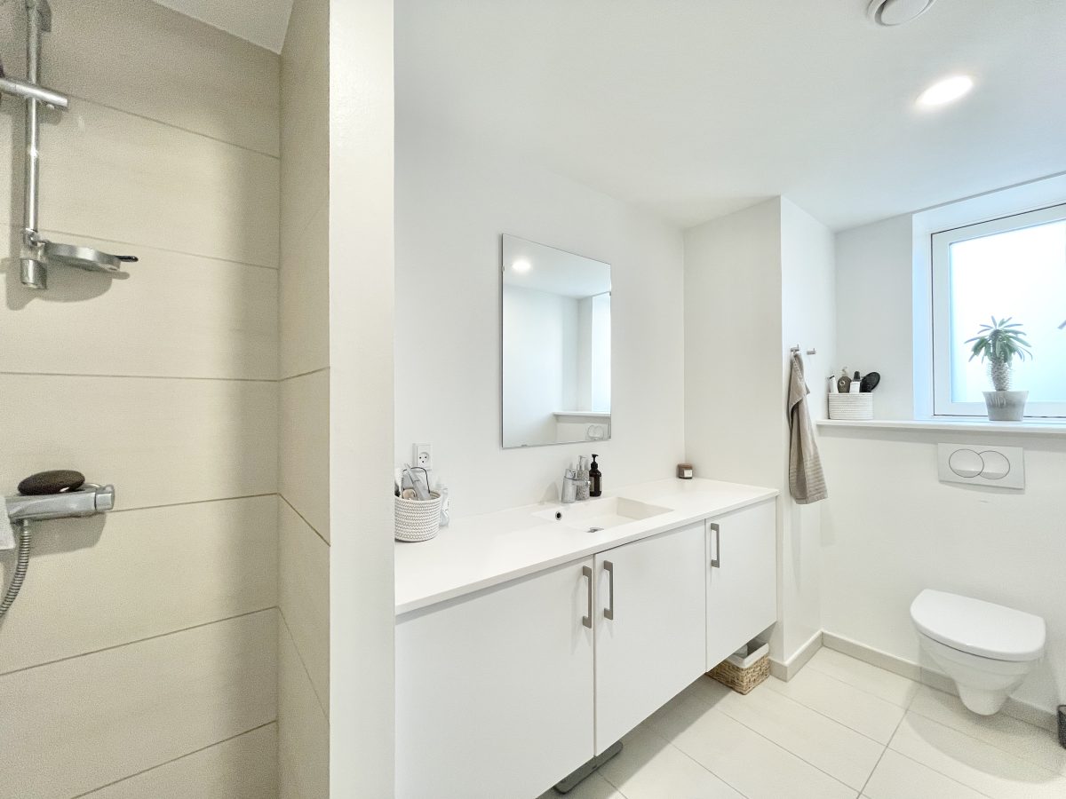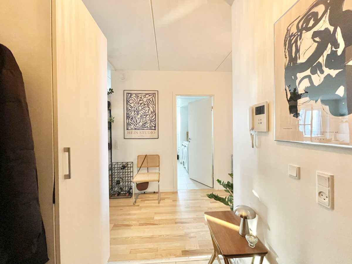 Fra den rummelige entré er der adgang til lejlighedens badeværelse, der både har vaskesøjle, bruseniche og gulvvarme.
