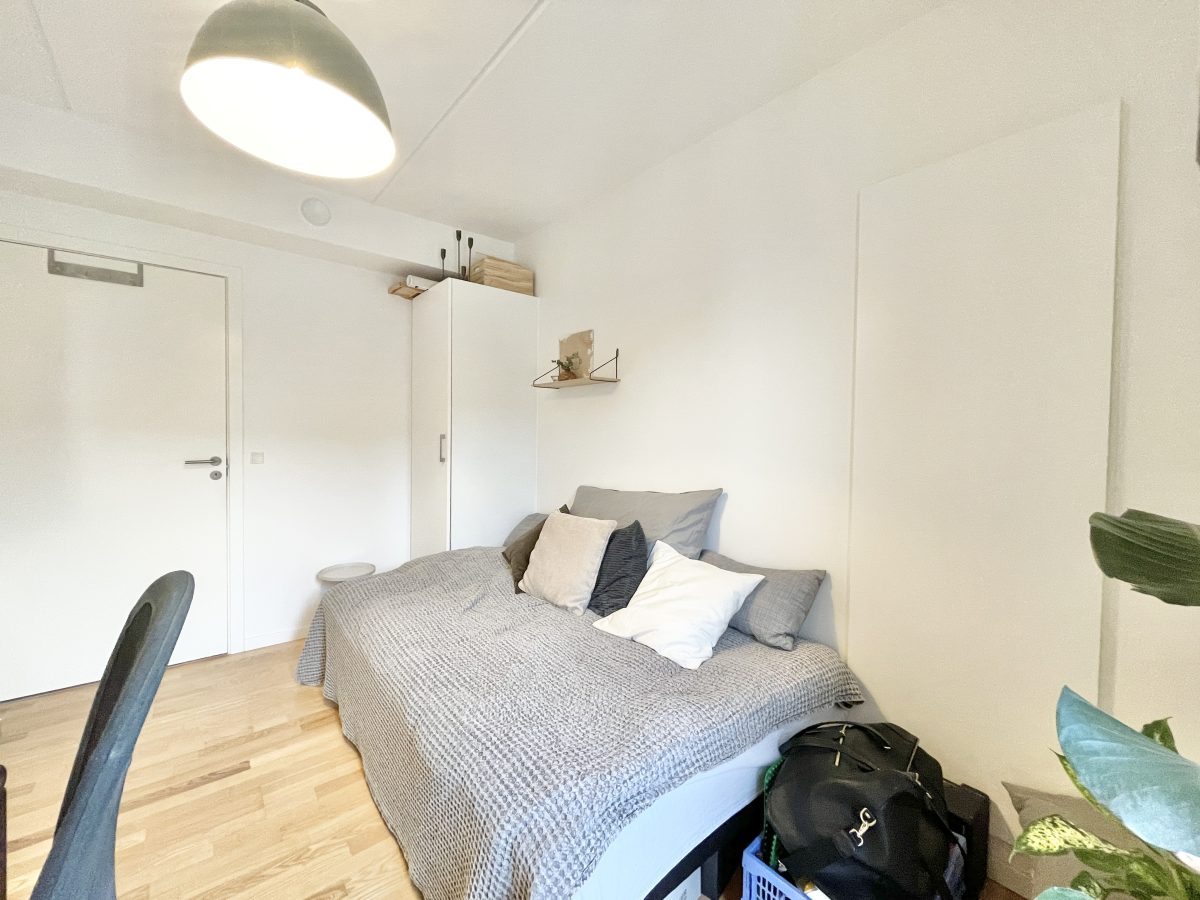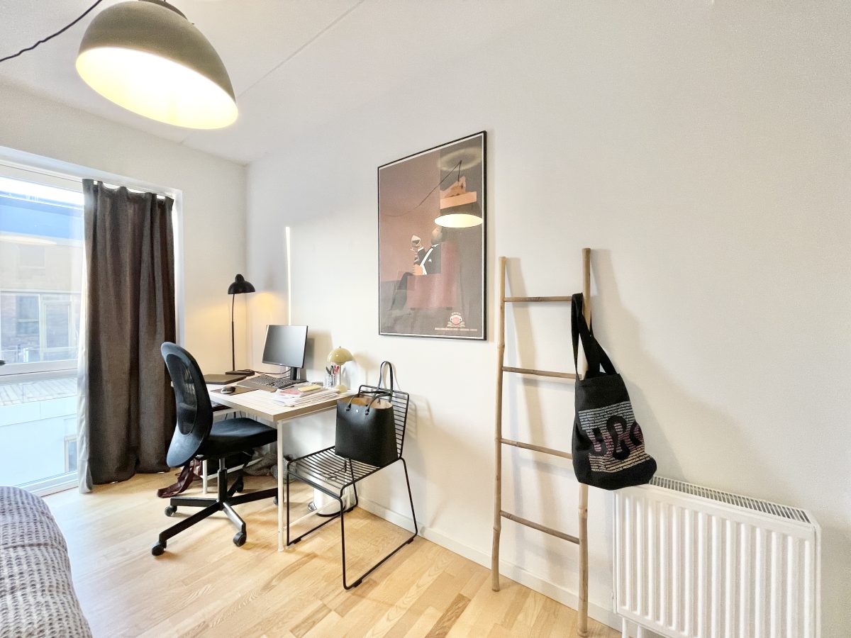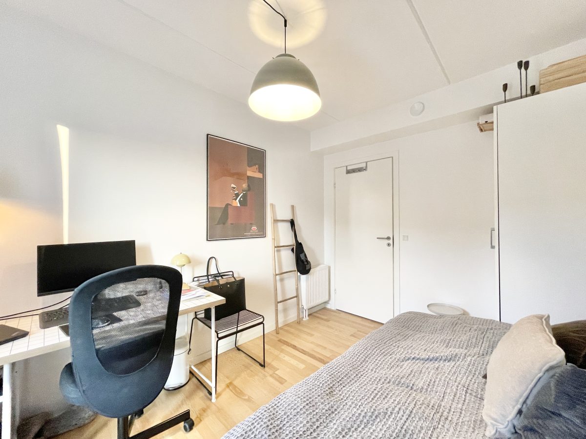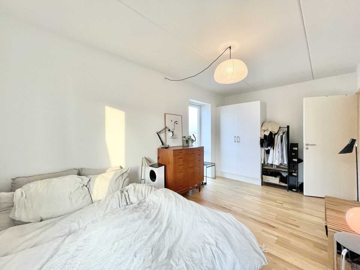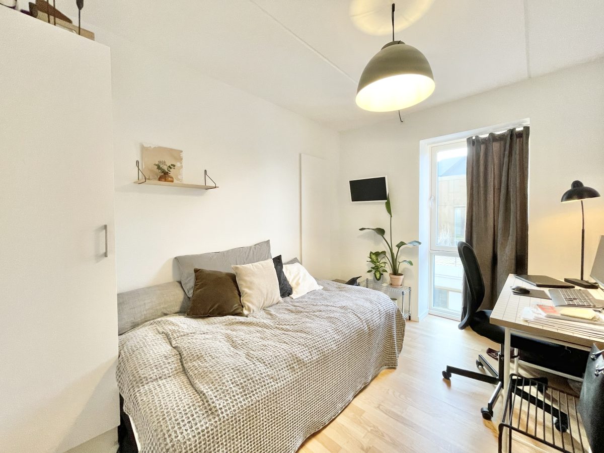 Soveværelset er godt udnyttet, hvor der både er plads til en stor seng - og skrivebord. I værelset er der ydermere indbyggede skabe - hvilket også er gældende for ekstraværelset.