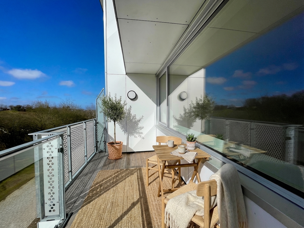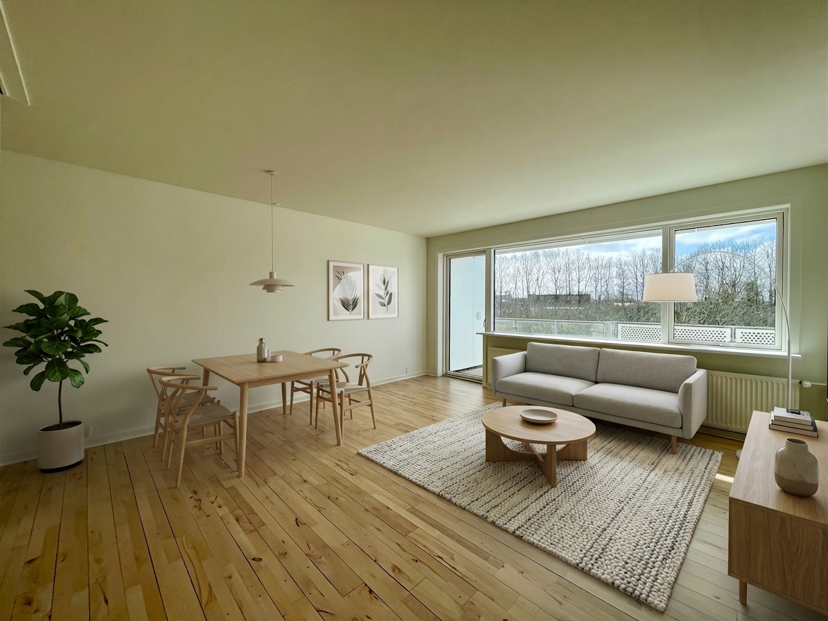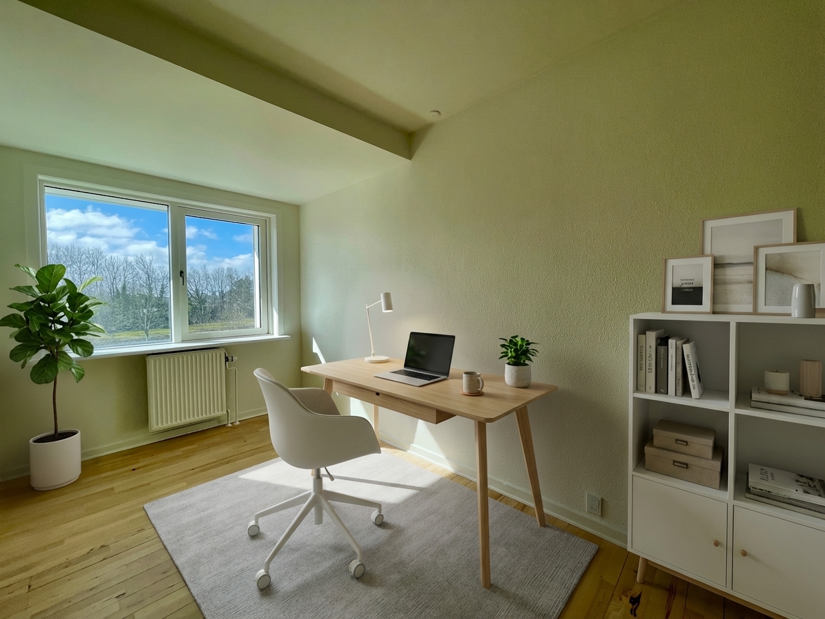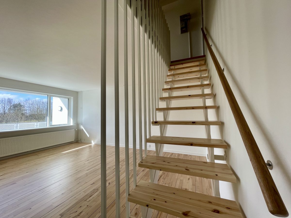 Lejligheden fremstår indbydende med et dejligt opholdsrum, hvor man har adgang ud til den store sydvestvendte altan. De store vinduespartier sikrer et skønt naturligt lysindfald, som skaber en lys og behagelig atmosfære i hele rummet. På 1 sal. befinder gæstetoilettet samt finder man tre rum, som kan fordeles ud på soveværelse, kontor og børneværelse.