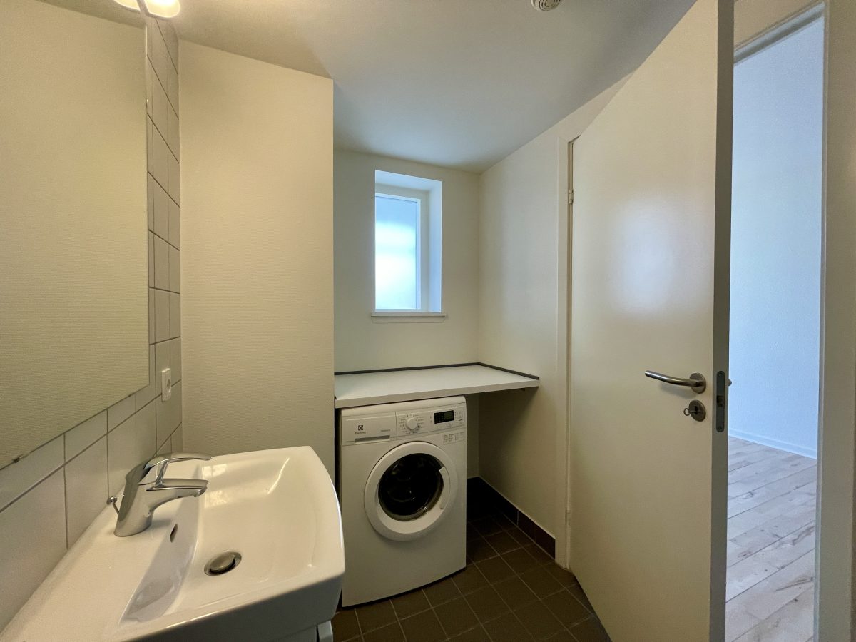 Derudover byder boligen på et funktionelt badeværelser med vaskemaskiner, samt eget depotrum til ekstra opbevaring. Foran ejendommen er der fri parkering, og der er mulighed for at have 2 katte efter aftale med udlejer.